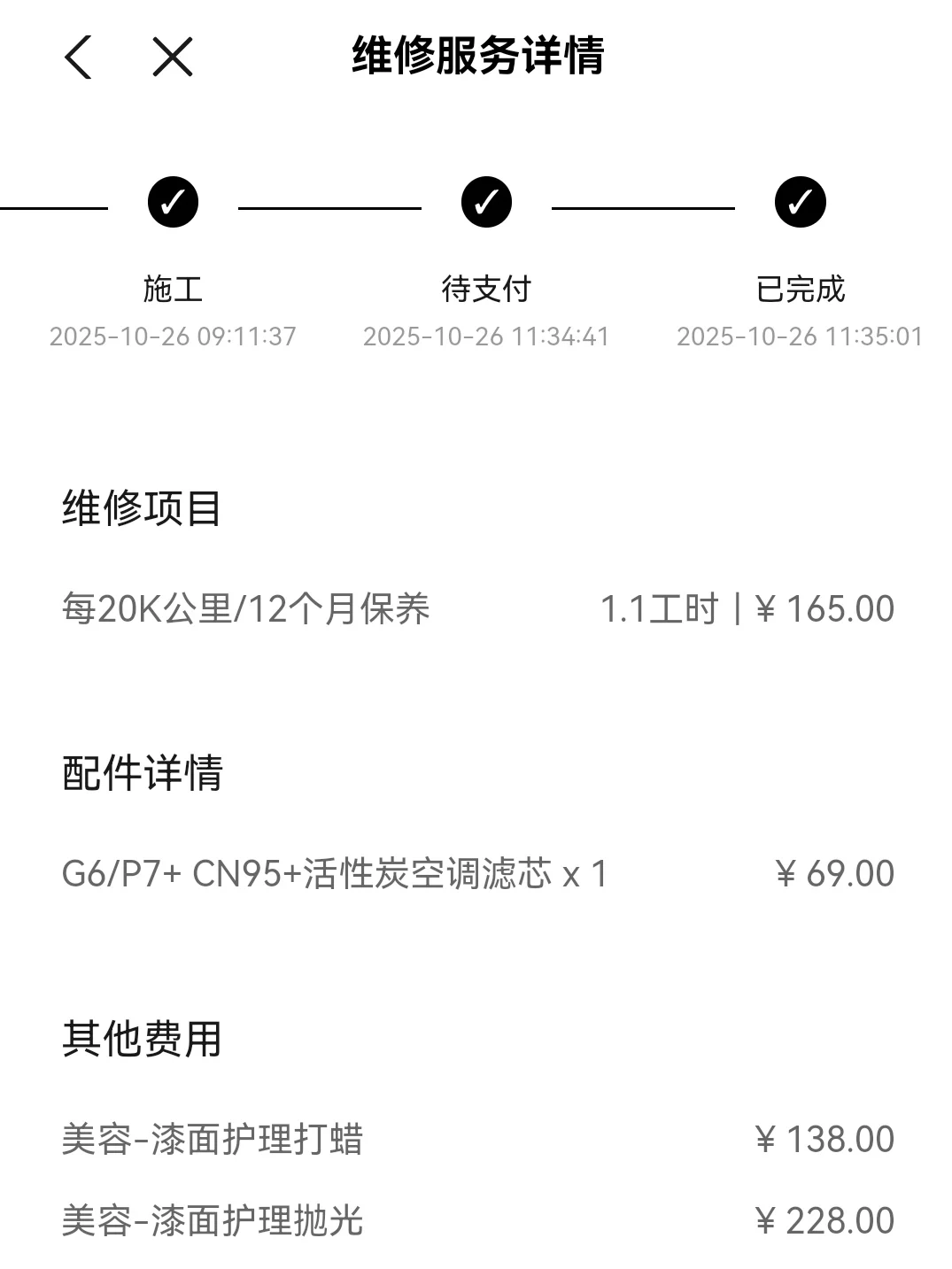 今年做了一次基础保养+漆面抛光打蜡,项目包括69元的空调滤芯、165元工时费、228元抛光和138元打蜡,总价600元,这是我加了抛光和打蜡,不然费用只有200多元。