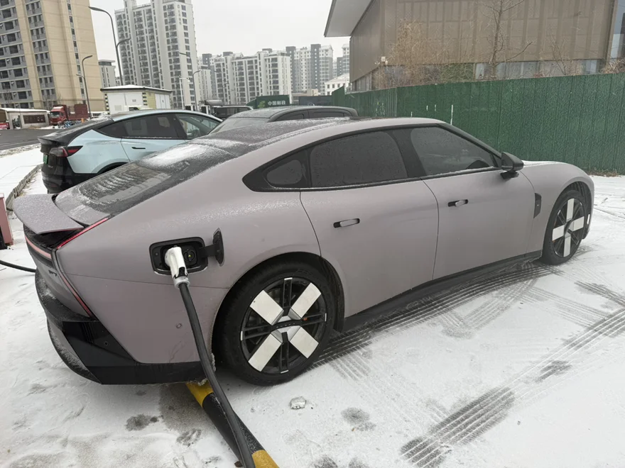 磨砂紫的车身配着薄雪,未来感拉满,路过的人都忍不住多看两眼👀。