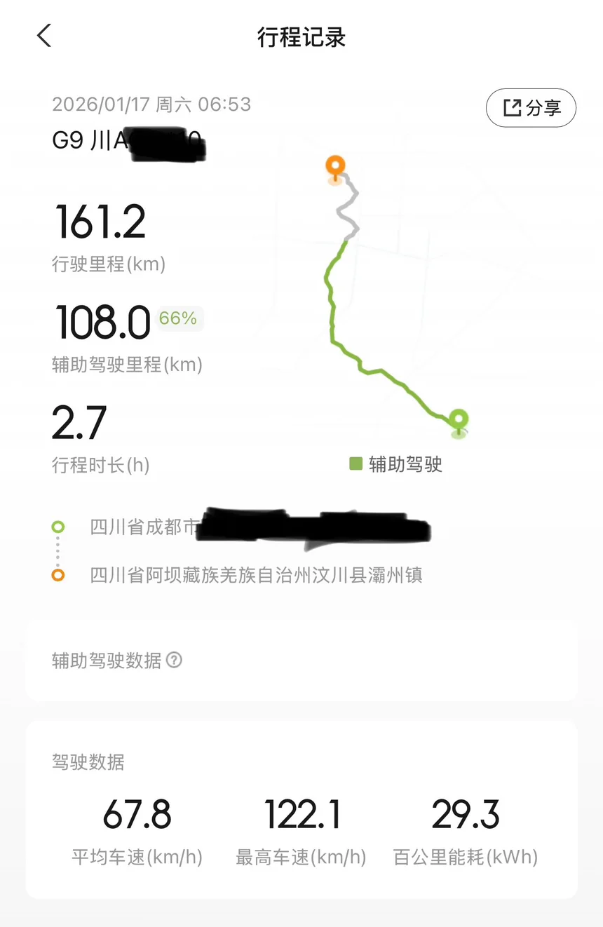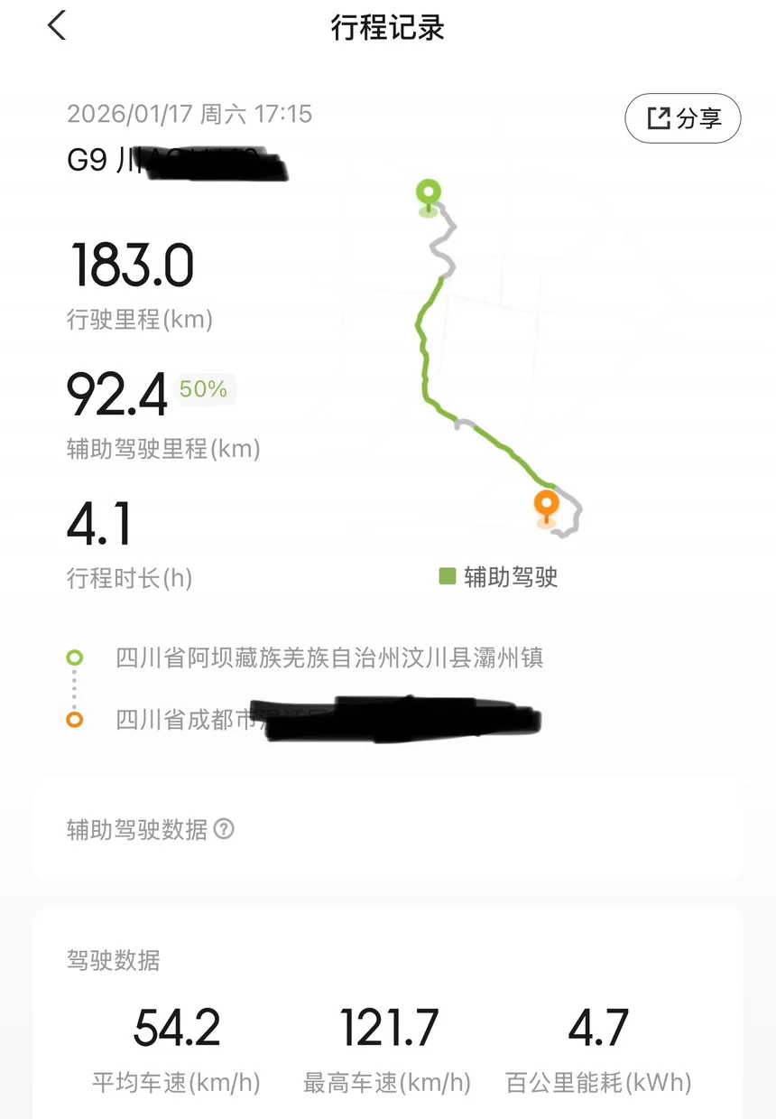 滑雪结束返程时电量依旧充沛,能量回收系统在长下坡路段持续充电,G9的电耗管理真的太厉害了,回家还剩100多公里电