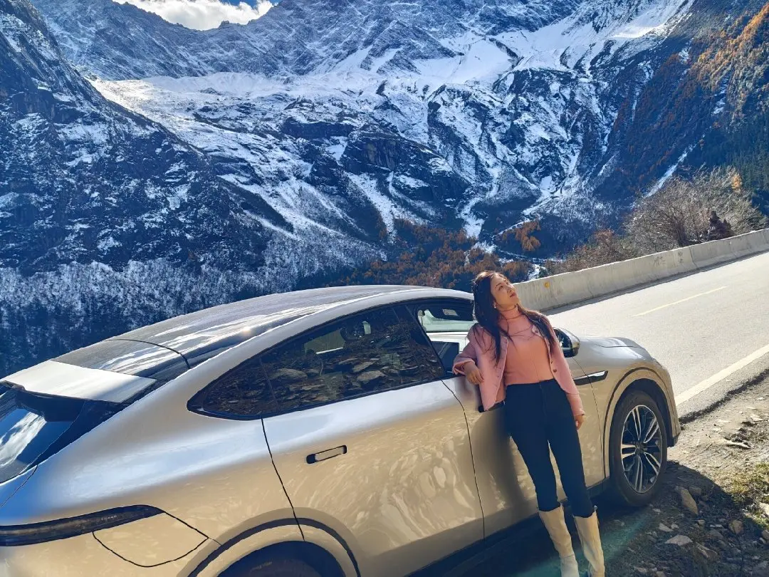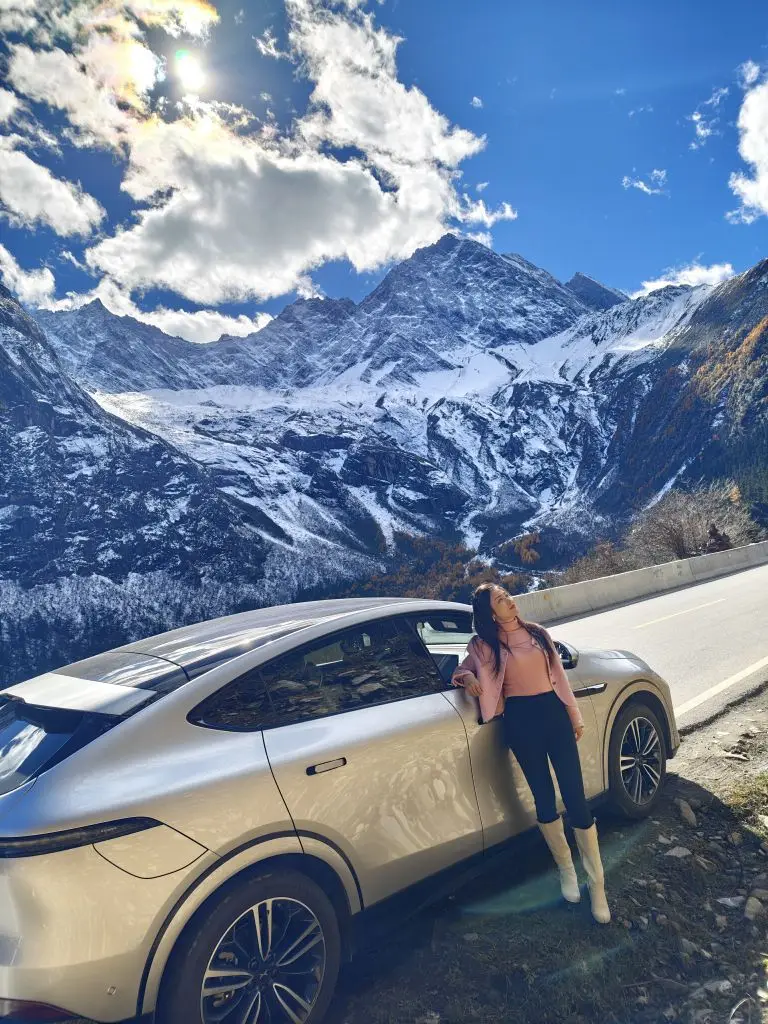 📸 图1:四姑娘山那天,早上出发时还担心山路难开,结果开着NGP一路稳得很,我只管看风景就行。停在雪山脚下,靠在车身上晒太阳,那种踏实感,只有G6车主才懂。