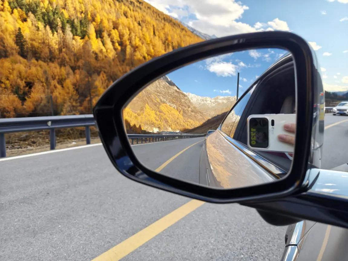 📸 图3:秋天走川西环线,后视镜里全是金黄的树林,随手一拍都是壁纸。G6的隔音真的好,关上车窗就是自己的小世界,听着歌,看着风景,赶路都变成了享受。