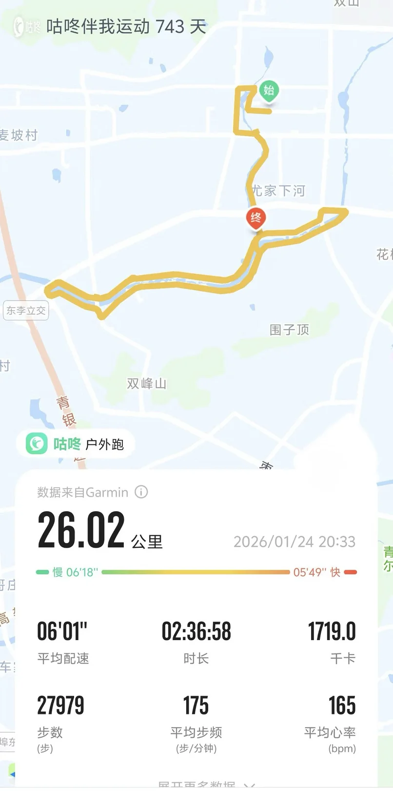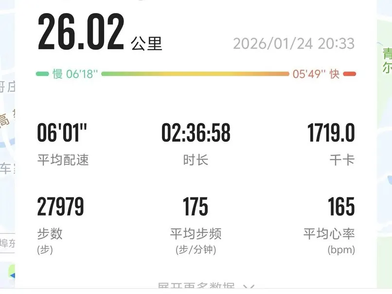 「山东 青岛」1月24日晚20点左右,完成一场夜跑。里程26.02公里,配速6分01秒,耗时2小时36分58秒,平均心率165bpm。夜风冷冽,步子迈得稳,跑完这段路,给平淡的日子添点劲儿。附上跑步轨迹图,冲一波活动总里程!