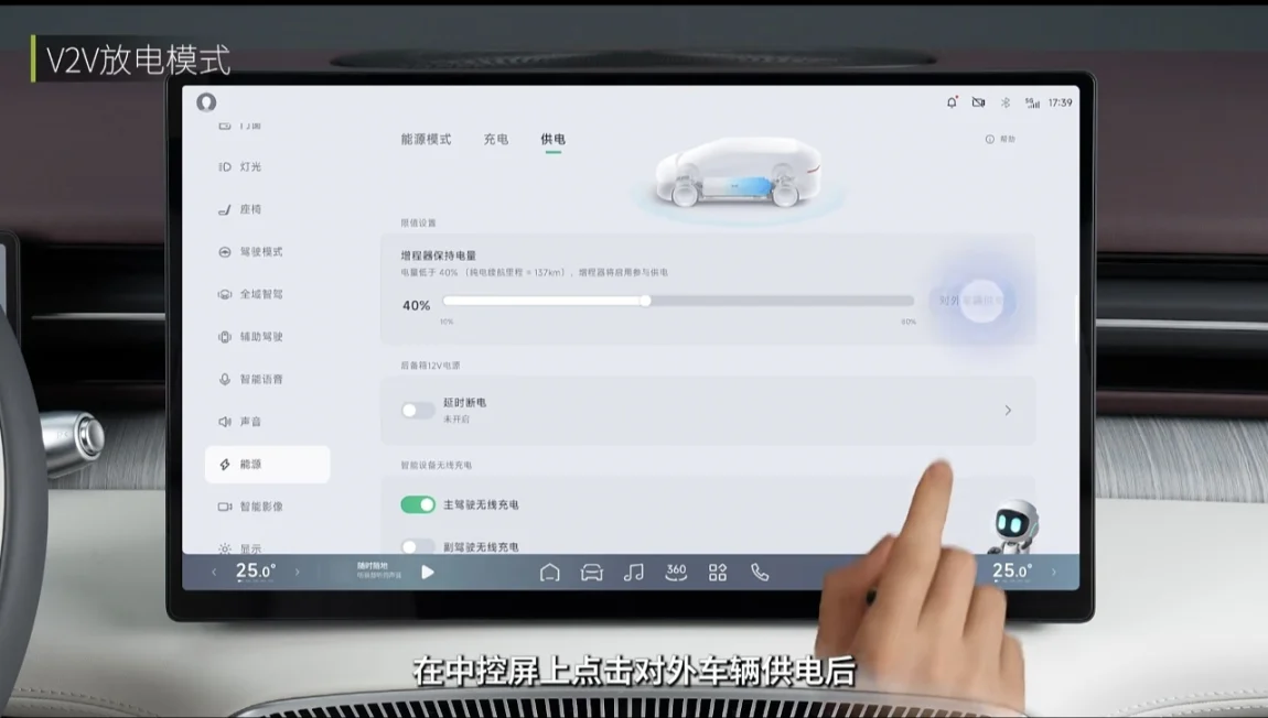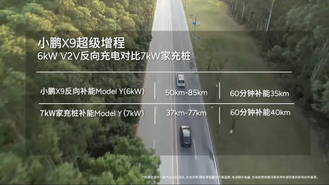那么,相比较于家充7kw,车对车的移动补能会不会充电速度慢,补能里程少?这其实主要取决于供电车的放电功率上限和电池大小。小鹏X9增程款的6kW放电功率,决定了单位时间的电能输出量,功率越高基础补能效率越高。