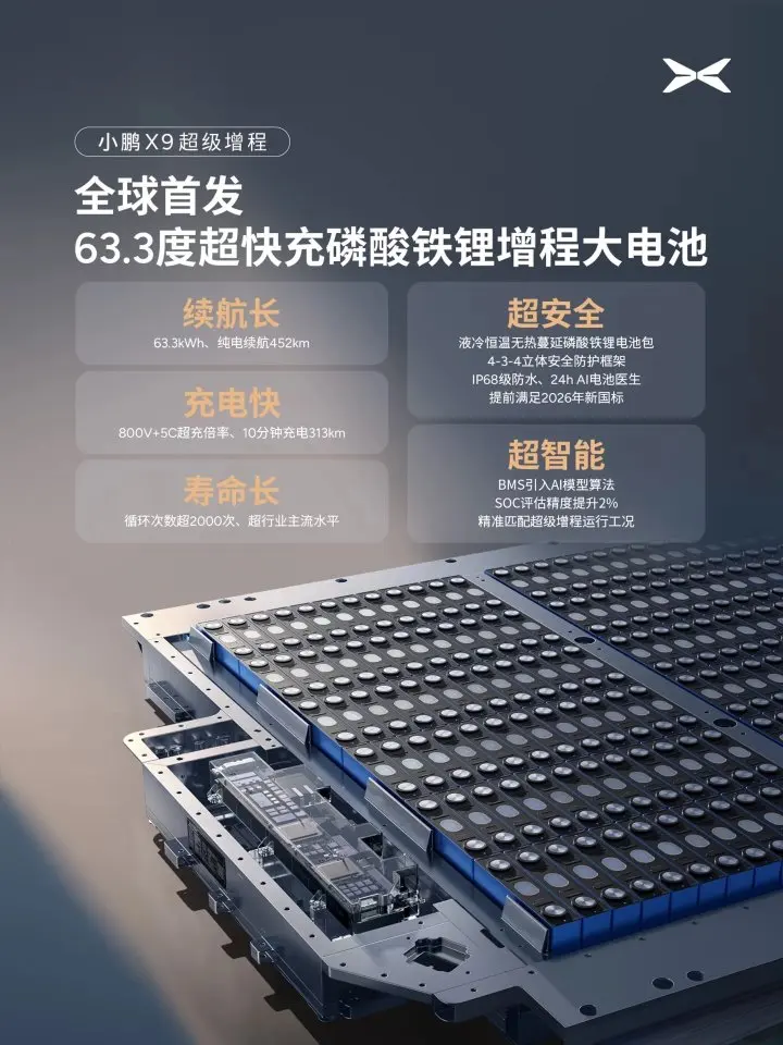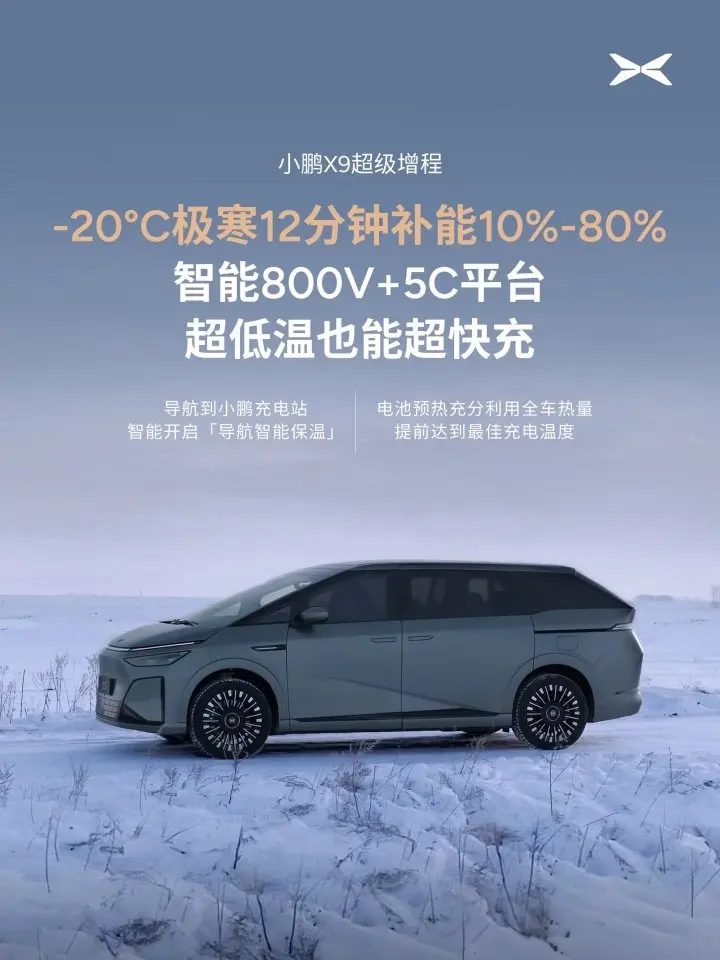最后的问题来了,给其他新能源车充电了,那供电车的续航怎么办?这个就得依赖于供电车的电池大小和自身的充电效率了。小鹏X9增程款的磷酸铁锂电池有63.3度,充电效率也是800V-5C,在高速上临时给其他新能源车辆补能个50km绝对没有问题,况且增程综合续航里程高达1600+km,下个服务区上个厕所十来分钟又可以充电到80%