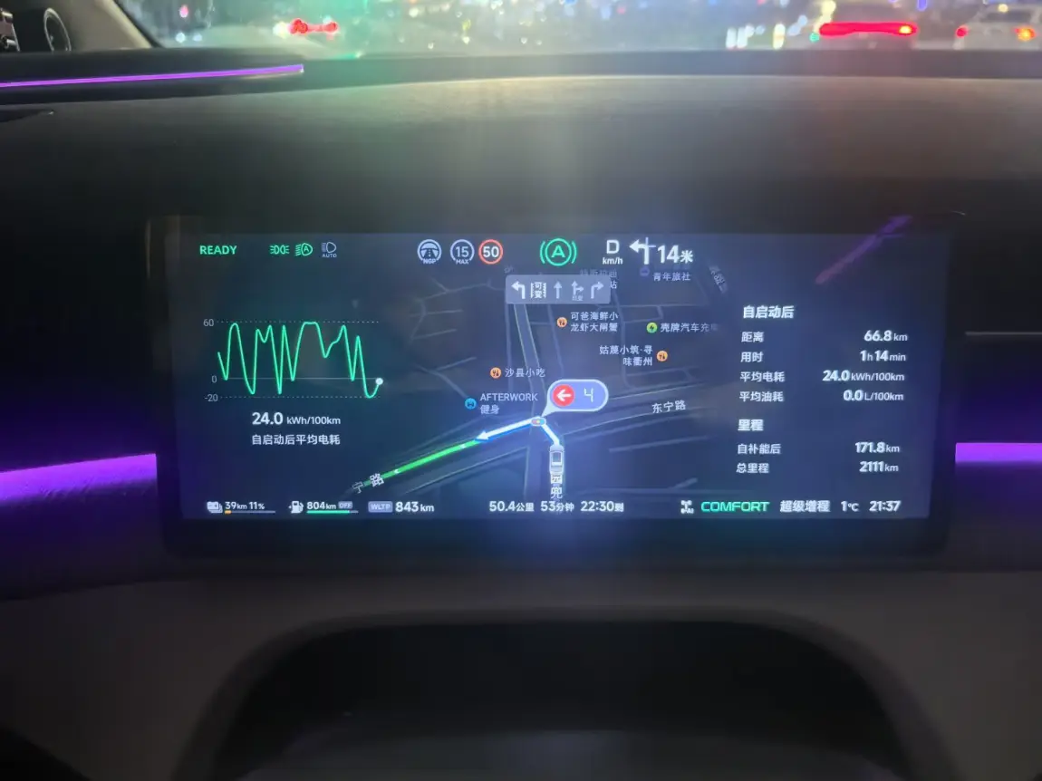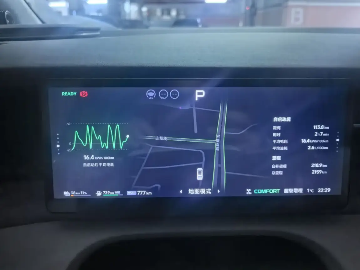 电池剩11%的时候,总里程刚好2111km,果断切了增程