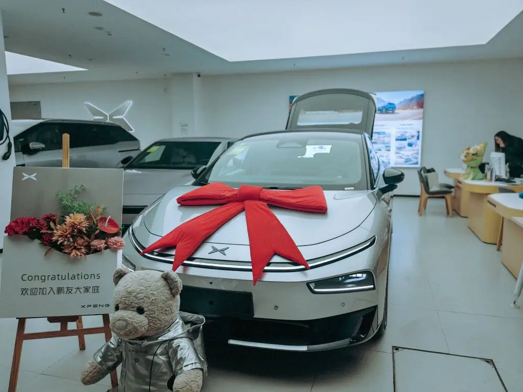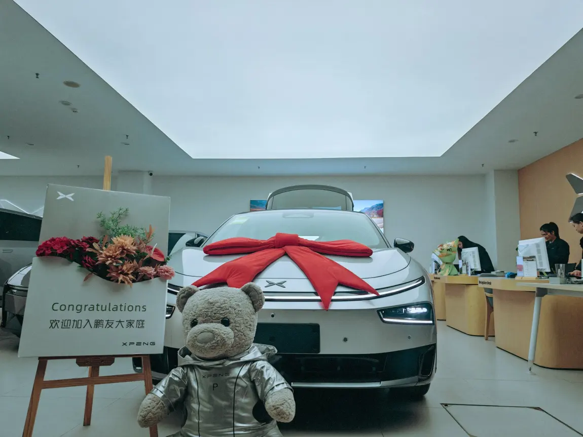 5. 仪式感拉满:最后就是提车仪式啦!工作人员提前布置好了车辆,红色蝴蝶结、欢迎牌和小鹏熊玩偶都安排上了,拍照超出片。
