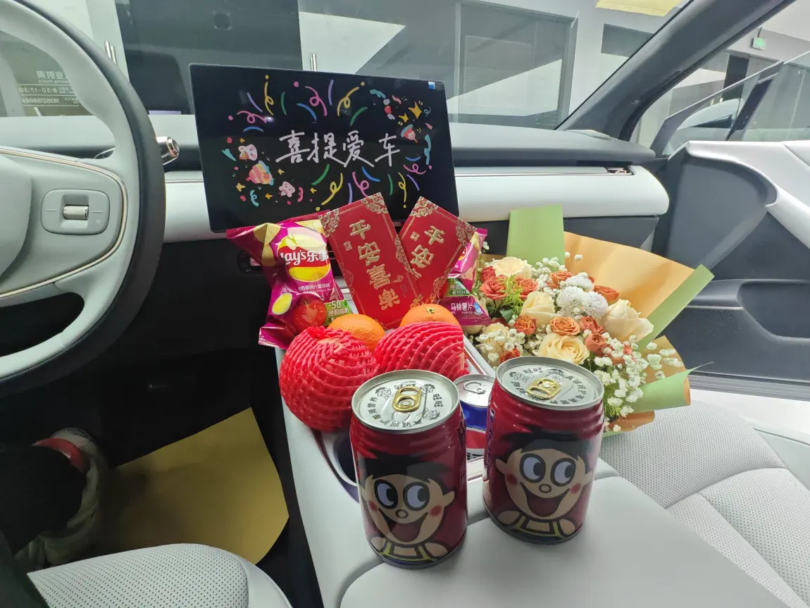 最让我惊喜的是后备箱里的提车礼,除了常规的鲜花和玩偶,还有满满一后备箱的寓意礼物:平安喜乐的礼盒、百事可乐、旺仔牛奶,甚至还有“一路生花”的鲜花束,每一样都透着用心。