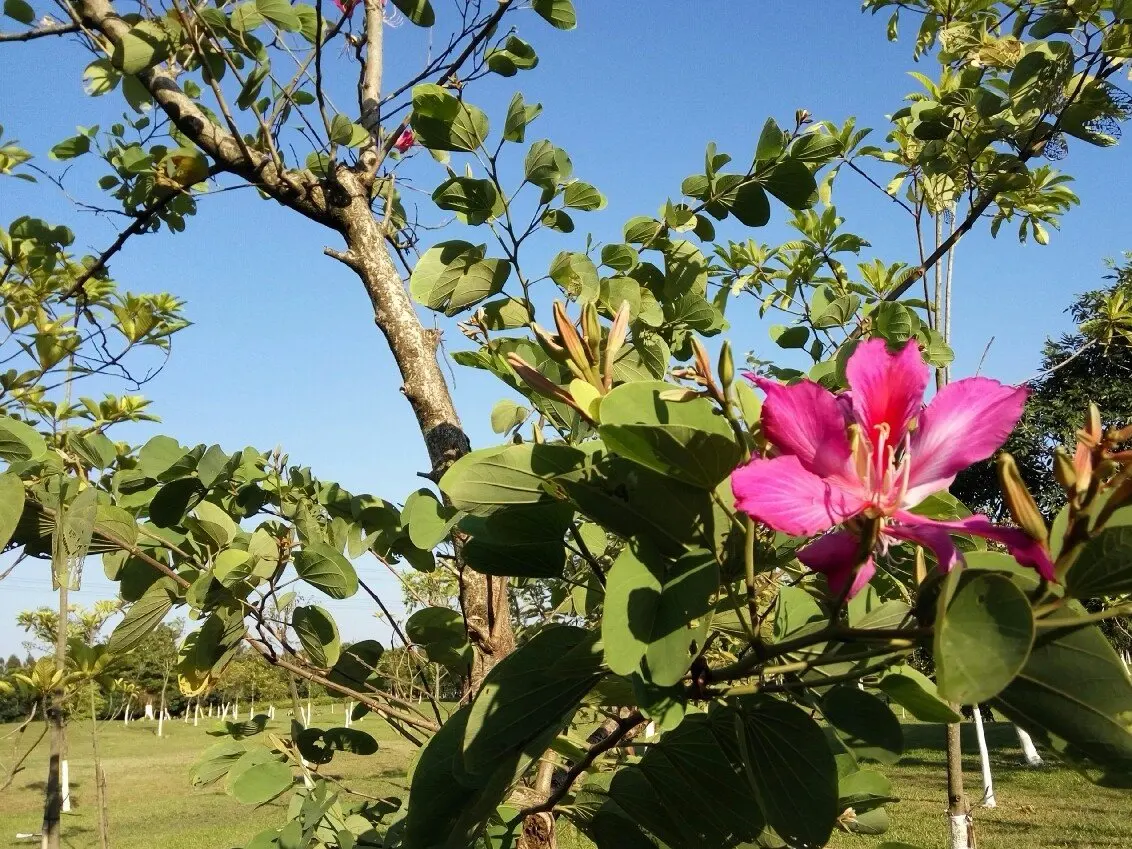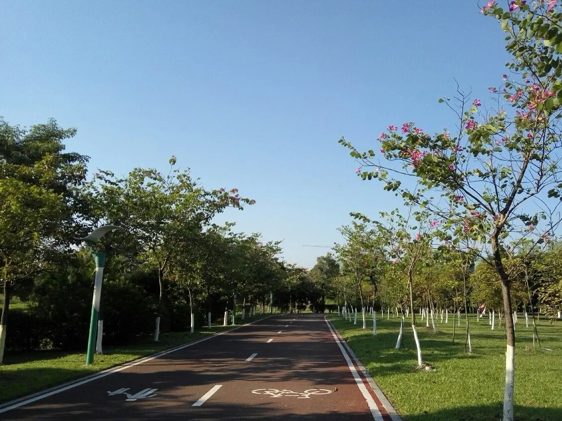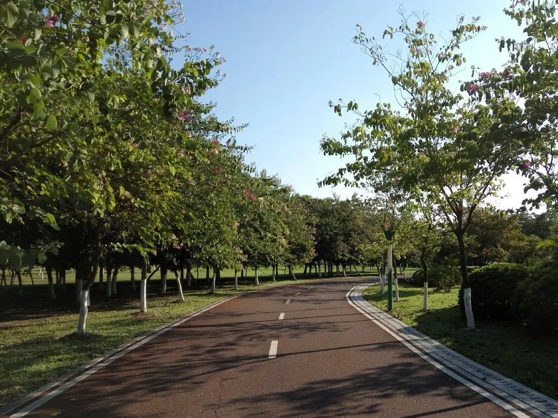 沿着专属骑行道向前,两侧紫荆树整齐排列,粉紫花瓣在风里轻轻颤动,偶尔有几朵落在车把上。平整有弹性的路面,让骑行变成了享受。阳光穿过树叶,在路面投下斑驳光影,我踩着踏板,仿佛穿行在流动的油画里。