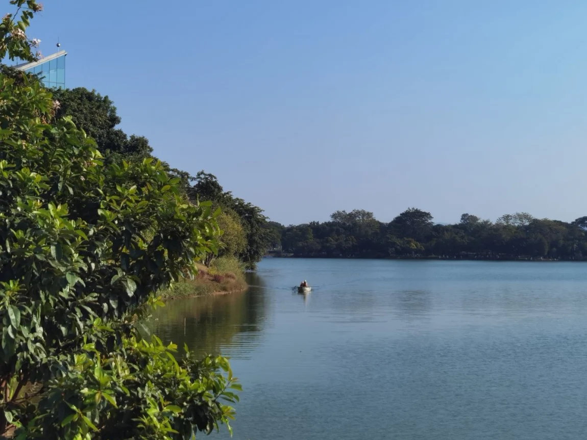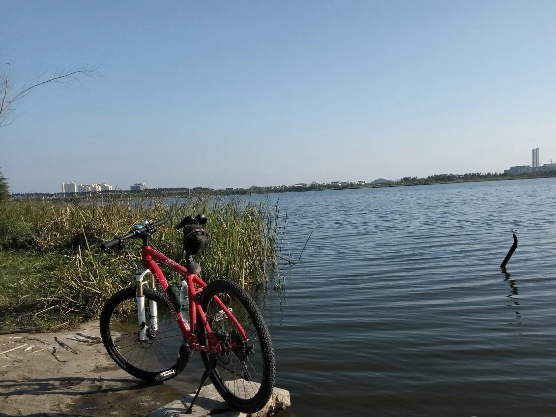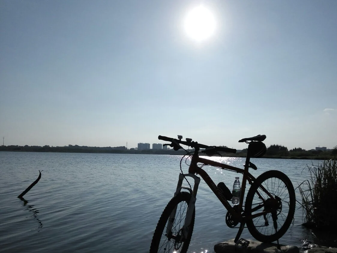 骑到湖边时,开阔的湖面瞬间让人心旷神怡。我把单车停在岸边,让它和波光粼粼的湖水同框。阳光在水面跳跃,远处高楼在薄雾里若隐若现。什么都不用想,就吹着湖风发发呆,连时间都跟着慢了下来。