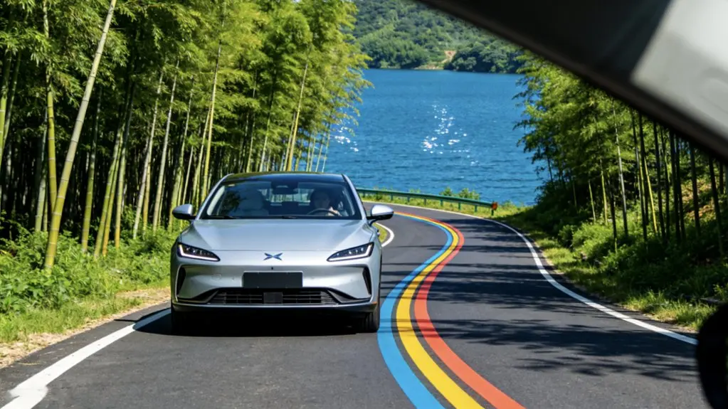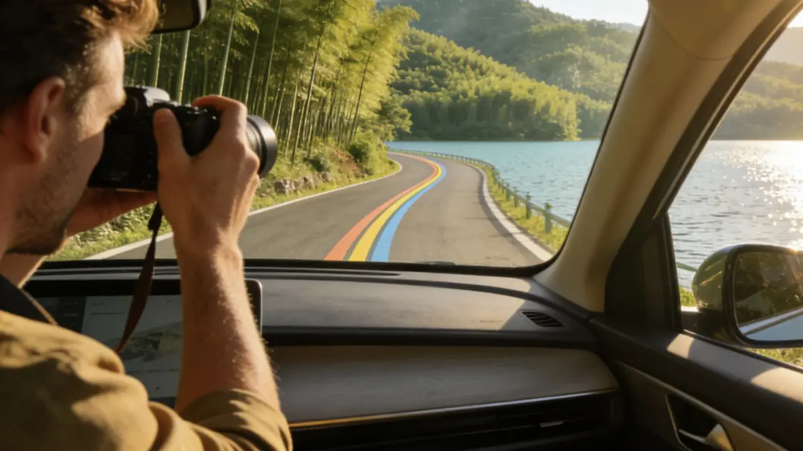我们沿着溧阳一号公路一路向南,车子碾过彩虹色的路面,像是在天地间铺开的调色盘上缓缓前行。车窗外是漫无边际的竹海,山风穿过竹叶沙沙作响,和小鹏的低鸣交织成最治愈的背景音。路过神女湖观景台时,我们停下车,远处湖水被风揉碎成一片碎金,和黛色的青山相映成趣,鹏友举着相机拍个不停,说这是他见过最温柔的东方山水。