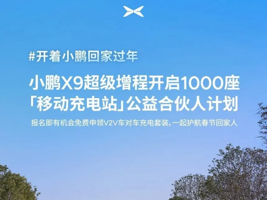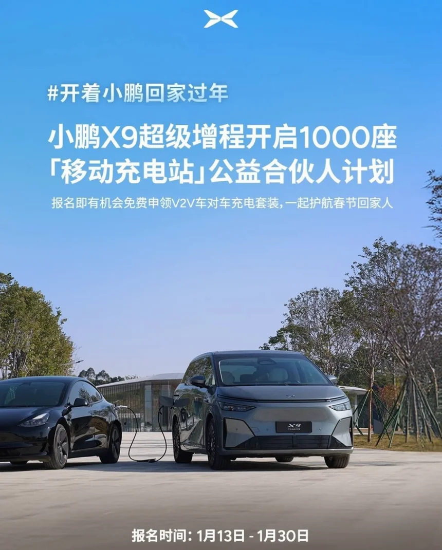 看到小鹏官网的活动,小鹏X9增程版车主可以报名成为“护航先锋”,变身“移动充电站”,在路途上免费为其他电车提供V2V充电服务。