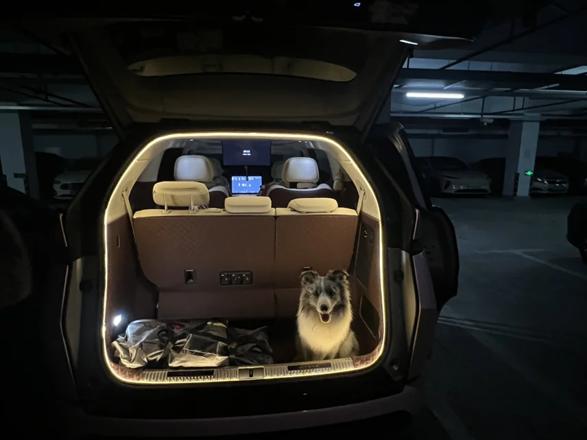 接下来的日子,整备车辆成了我的核心任务。纯手工羊毛毯虽价格不菲,但踩上去的柔软厚实感,让我毫不犹豫下单,毕竟长途久坐的舒适感至关重要;全套防踢装备必须拉满,后背防踢垫+二排侧面过道防踢垫双管齐下,彻底杜绝孩子们上下车时的无意划痕;车门静音条安排上,能大幅降低高速风噪,再搭配车门防踢翻毛皮,实用与质感直接拉满。家里的“逆子”也不能亏待,后备箱规划为它的专属空间,全包围皮革防刮防水垫精准贴合,杜绝指甲刮伤,顶部加装的氛围灯既增亮又添温馨,让它的小天地舒适又安全。