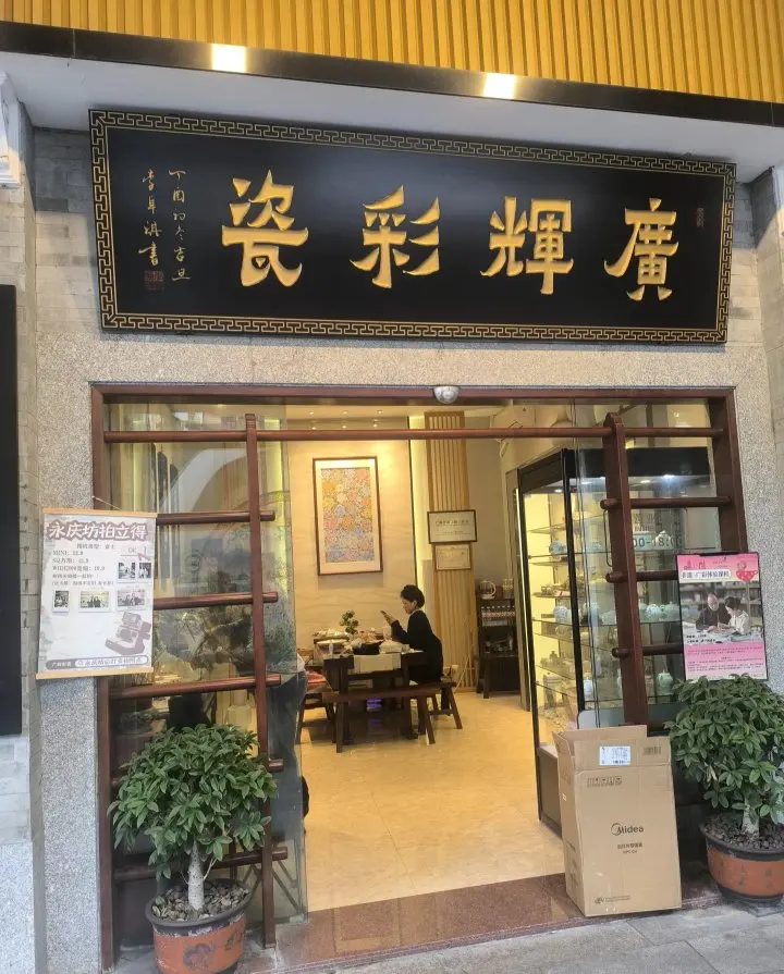 我提前预约了广彩瓷绘制体验,让他亲手在瓷盘上画出一朵木棉花。
