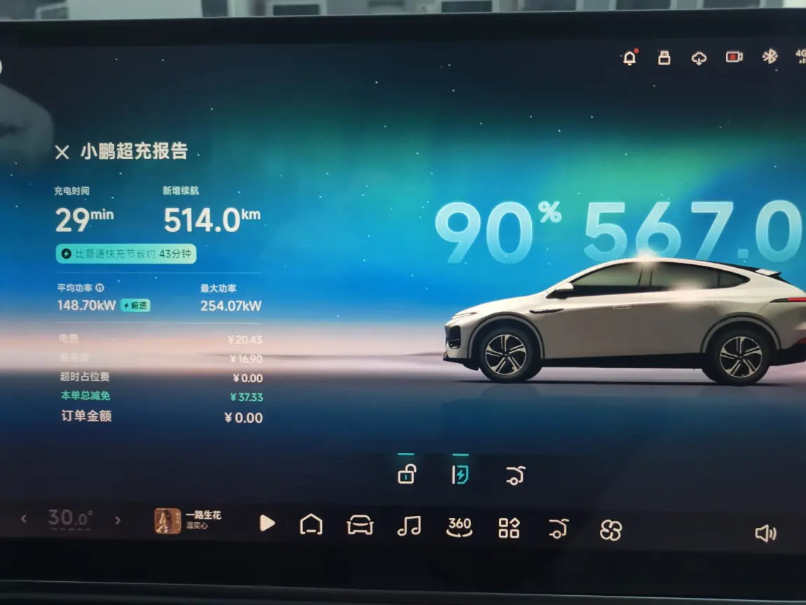 - 超充实力硬核:出发前电量仅剩20%,我选择了小鹏超充站补能。G6的800V高压平台果然给力,峰值功率达到258.5kW,仅用29分钟就从20%充到90%,新增续航514公里,比普通快充节省了43分钟。等一杯咖啡的功夫,就满电复活,彻底告别续航焦虑。
