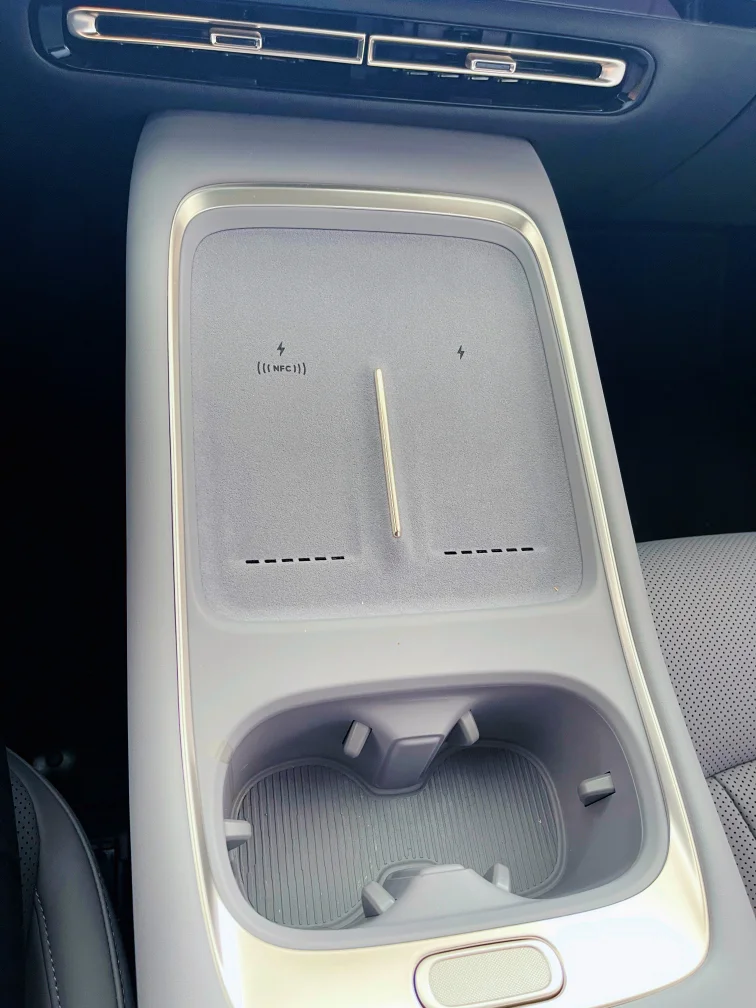中控箱上的无线充电区域,老款是普通塑料面板双50W无线充,易留划痕;而26新款升级为仿麂皮双50W快充面板,散热更好、充电更快,还能减少手机滑动和磨损。