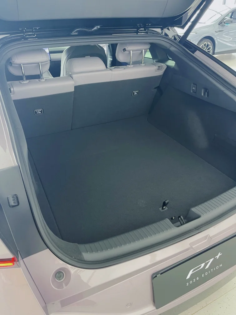 新款p7+依旧全系标配电动掀背尾门,开口达1米级(长/宽/高近1m),大件行李/婴儿车/露营装备进出超方便,尾箱空间依旧是那么大,不论纯电还是增程,700多L的常规容积,尾箱地板纯平,两侧轮拱侵占小。