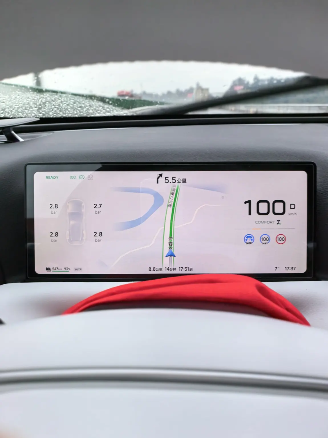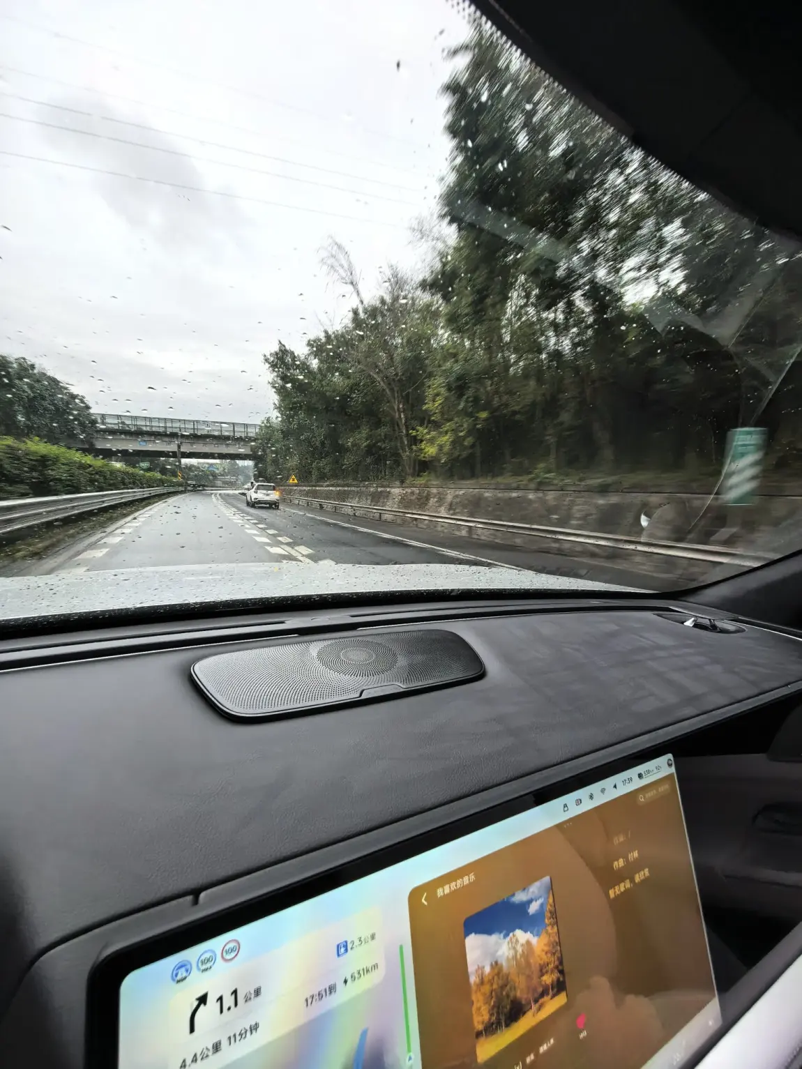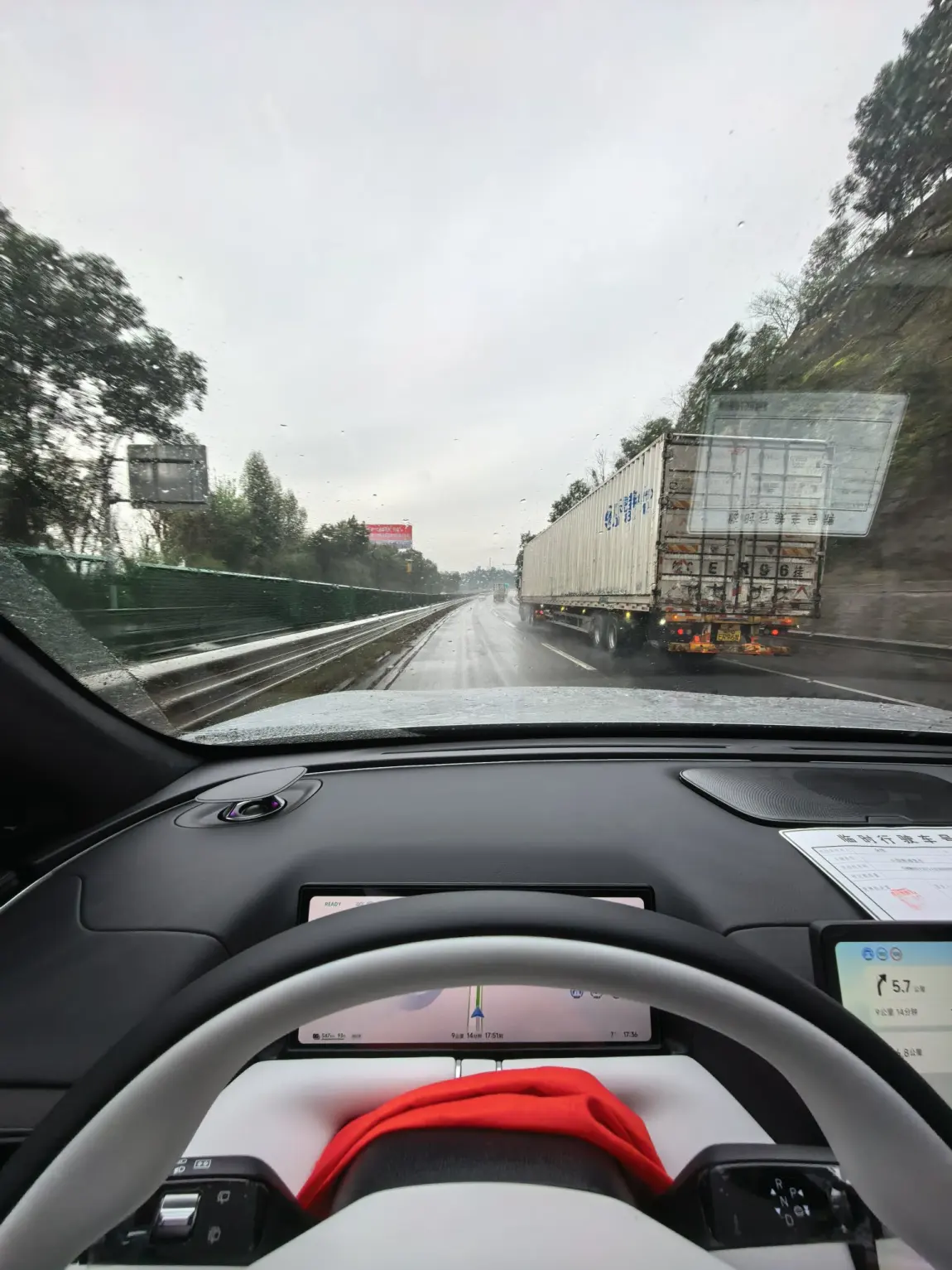 刚出发,我就打开了NGP。仪表盘上的蓝色车道线亮起,系统立刻接管了方向盘、油门和刹车。最让我惊喜的是,在湿滑路面上,它对大货车的预判和处理非常老道。