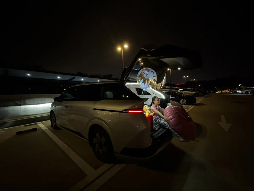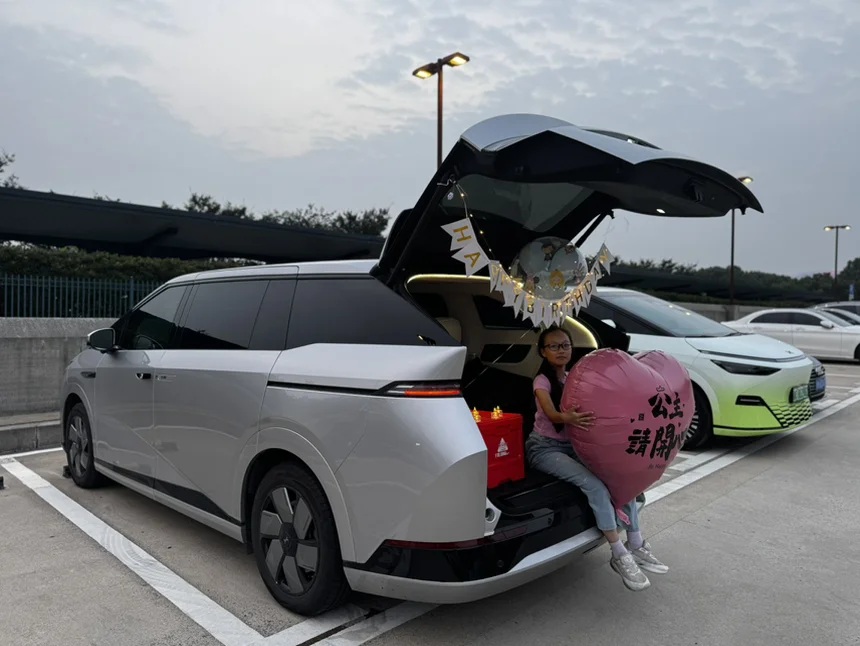 傍晚时分,我将小鹏X9的第三排座椅一键收纳,2554L的超大后备箱瞬间变身惊喜剧场。暖黄灯串缠绕箱沿,粉色气球缀着艾莎贴纸,女儿最爱的玩偶捧着蛋糕,下沉式空间里藏满糖果与绘本,每一处都藏着精心设计的温柔。