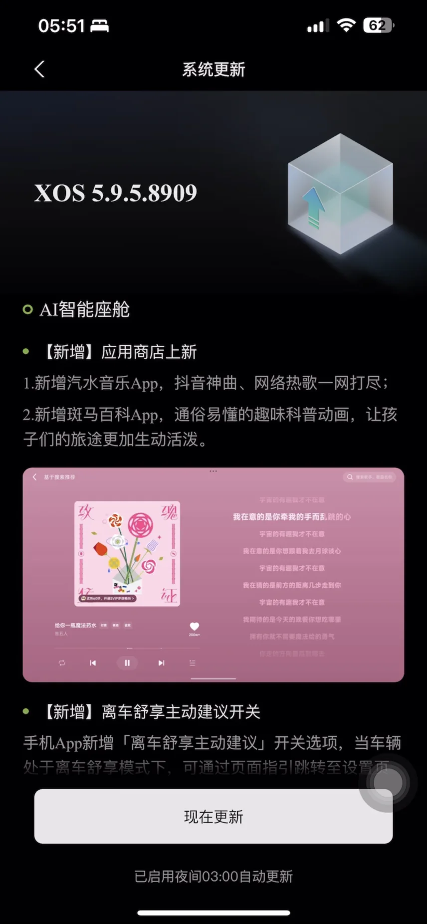 今天凌晨又收到车机更新推送了,果断更新,版本号还是5.9.5,应该是微更新,我们先锋团已使用这个版本一个多月了,各种激动兴奋,但限于保密要求,不让提前发出,见证了NGP更拟人化、老司机的进程。