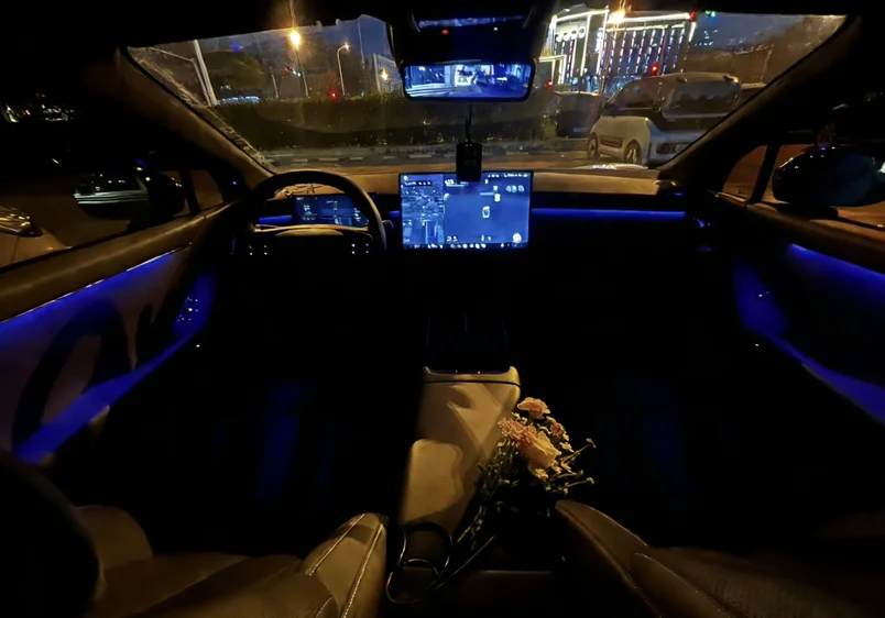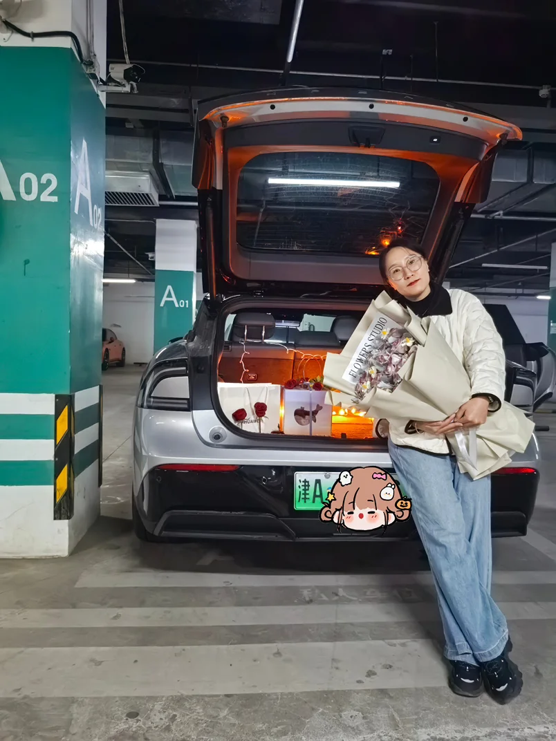 看到她从办公楼走出来,到车位后备箱缓缓弹开。她惊喜地捂住嘴,眼里闪着光。上车后,暖光氛围灯裹着我们,幸福感扑面而来。