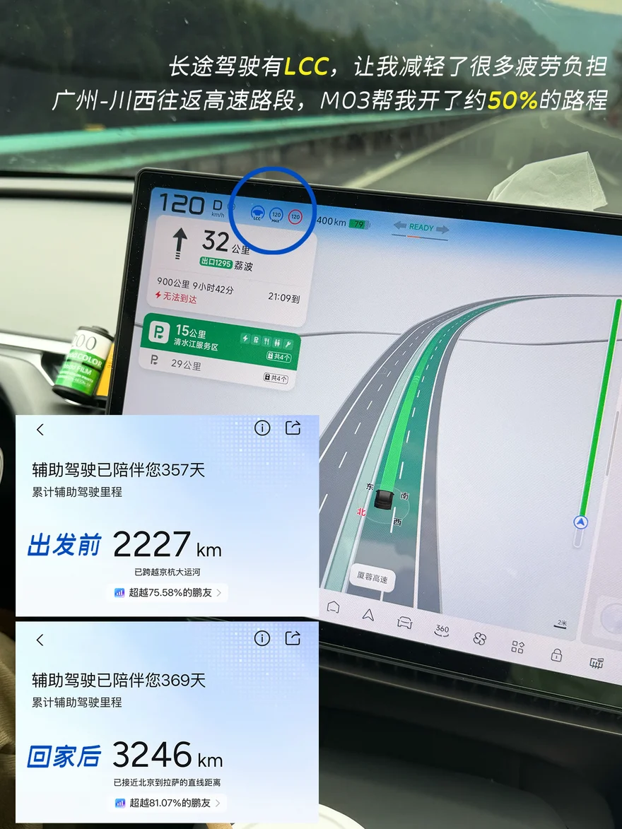 现在我开着M03上高速,在晴朗白天光线良好,道路线清晰的条件下,我会直接开LCC辅助驾驶,跑高速真的减轻了很大负担。