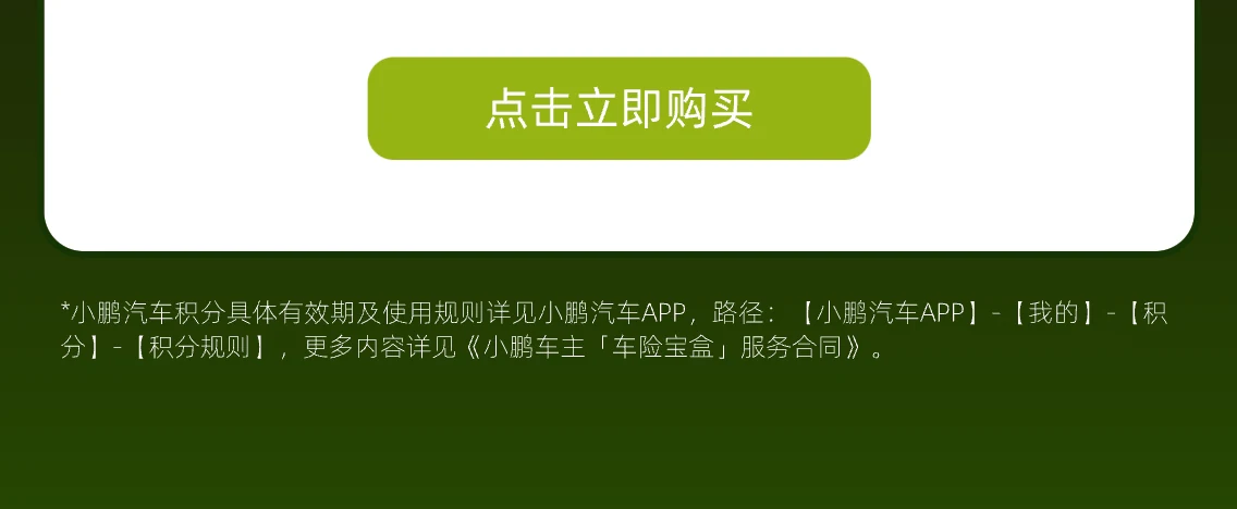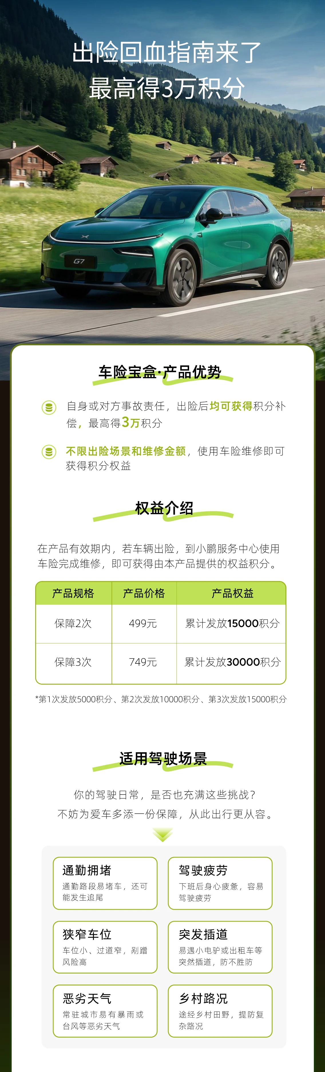 新年出行有备无患,小鹏车险宝盒 ——出险即返积分,不限事故责任方,最高得 3万积分,小意外变身小惊喜!