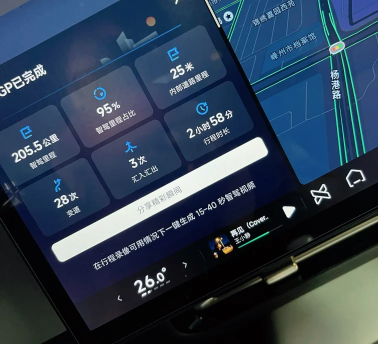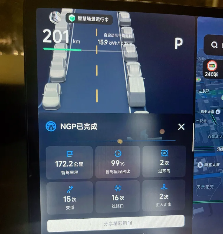 2月6号晚8点,上海,2℃,大雪漫天,车辆WLTP剩余463km,风雪挡不住归家路。全程开启NGP,将操控交给小P,即便路上车流量大,小P也应对自如、稳如老狗,一路“起飞”前行。