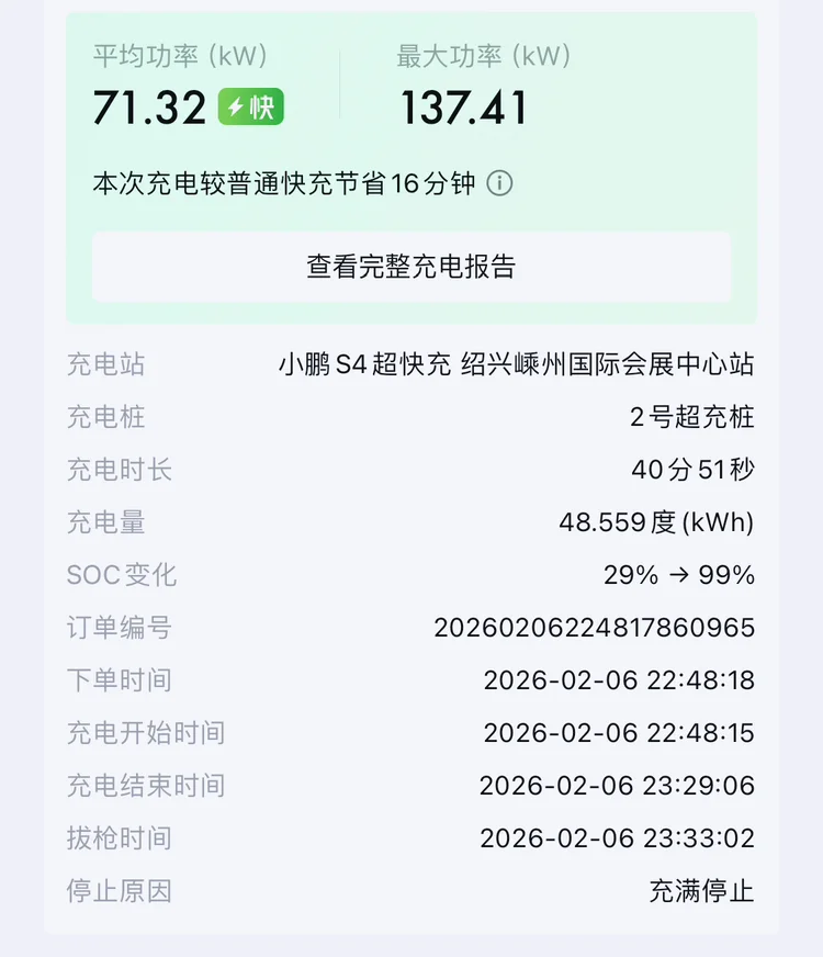 充电约41分钟,峰值功率137kW,直接充至满电WLTP 495km,花费23元,用积分兑换的电卡全额抵扣,相当于免费充电,太香了!该充电站晚10点半后电价不到6毛/度,小鹏S4超充又快又划算,提醒大家:规划好路线,下高速充电性价比拉满。