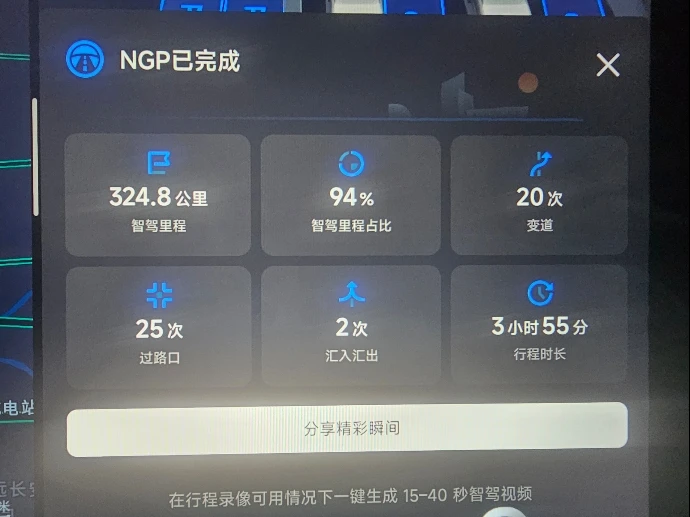 踏上回家的归途,小鹏NGP一路相伴护我周全,这份安心感拉满。提车不到一年,智驾里程已达2.4W公里,从初识到熟悉,人和车早已磨合到位,无论是高速巡航还是复杂路况,NGP的表现都越来越顺手。一路走走停停,智驾让归途少了疲惫,多了从容。感恩这份陪伴,也见证着小鹏智驾的点滴进步。新岁启封,带着这份安心继续奔赴前路,期待小鹏智驾未来解锁更多惊喜,越做越好,一路畅行!