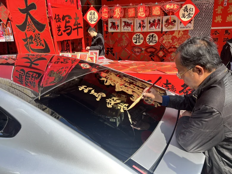 从图片的俯拍视角望去,车尾的黑色玻璃上,金色的书法字体肆意铺展,“龙马精神”四个大字苍劲有力,龙纹与马形的笔触交织,恰好呼应着2026马年的到来,旁边“出马必当先”“马上发财”的小字,将新年的期许藏在俏皮的祝福里。玻璃上的六边形纹路如铠甲般排列,灯光折射下,金色字迹与纹路相映,让这份年味多了几分精致的设计感。下方贯穿式的红色尾灯亮起时,如一道红绸划过,与金色书法形成冷暖对比,而保险杠上可爱的卡通贴纸,又为这份庄重添了几分灵动。