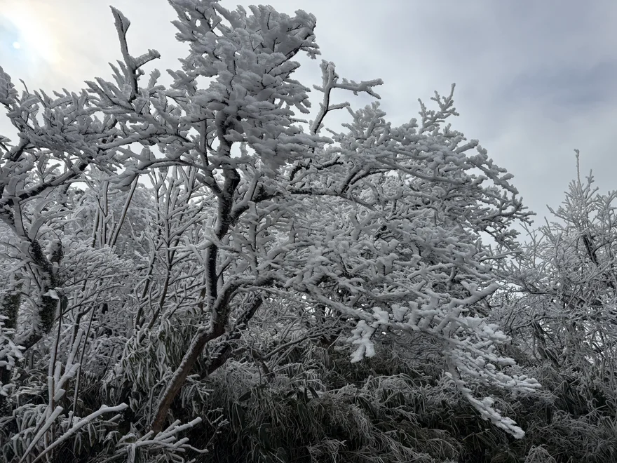 远远望去,两岸的树木已褪去寻常模样,枝桠间缀满洁白晶莹的霜花,那便是雾凇——非雪非冰,是水汽在低温中凝华的自然奇景,松针、柳条、灌木,都被这天地匠心细细雕琢,裹上一层蓬松剔透的冰晶羽衣。