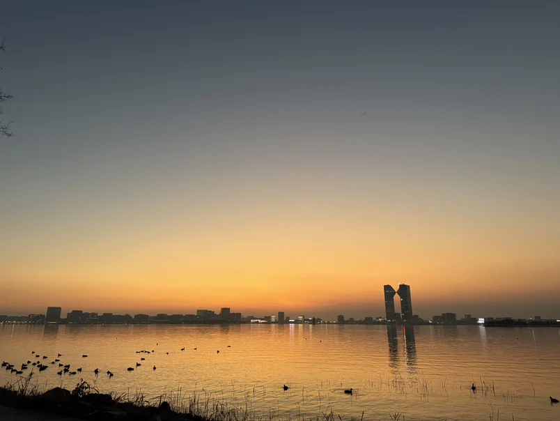 傍晚时候也可以欣赏落日的余晖,湖边天边范着金黄。看水上的鸭子在湖中嬉戏,捕食。