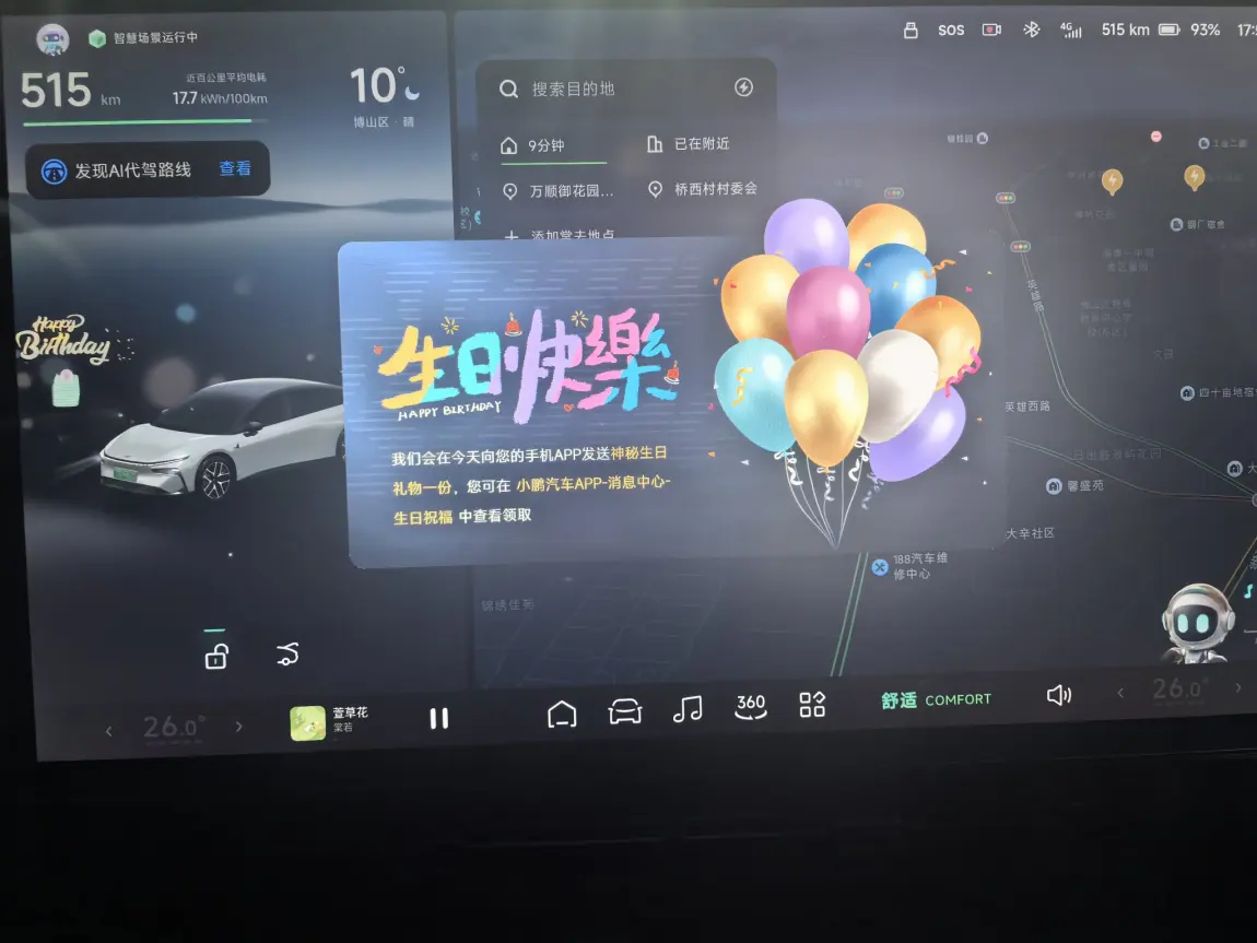生日那天,上车中控的惊喜是当天收到的第一声祝福,祝自己生日快日的同时也预祝小鹏越来越好。