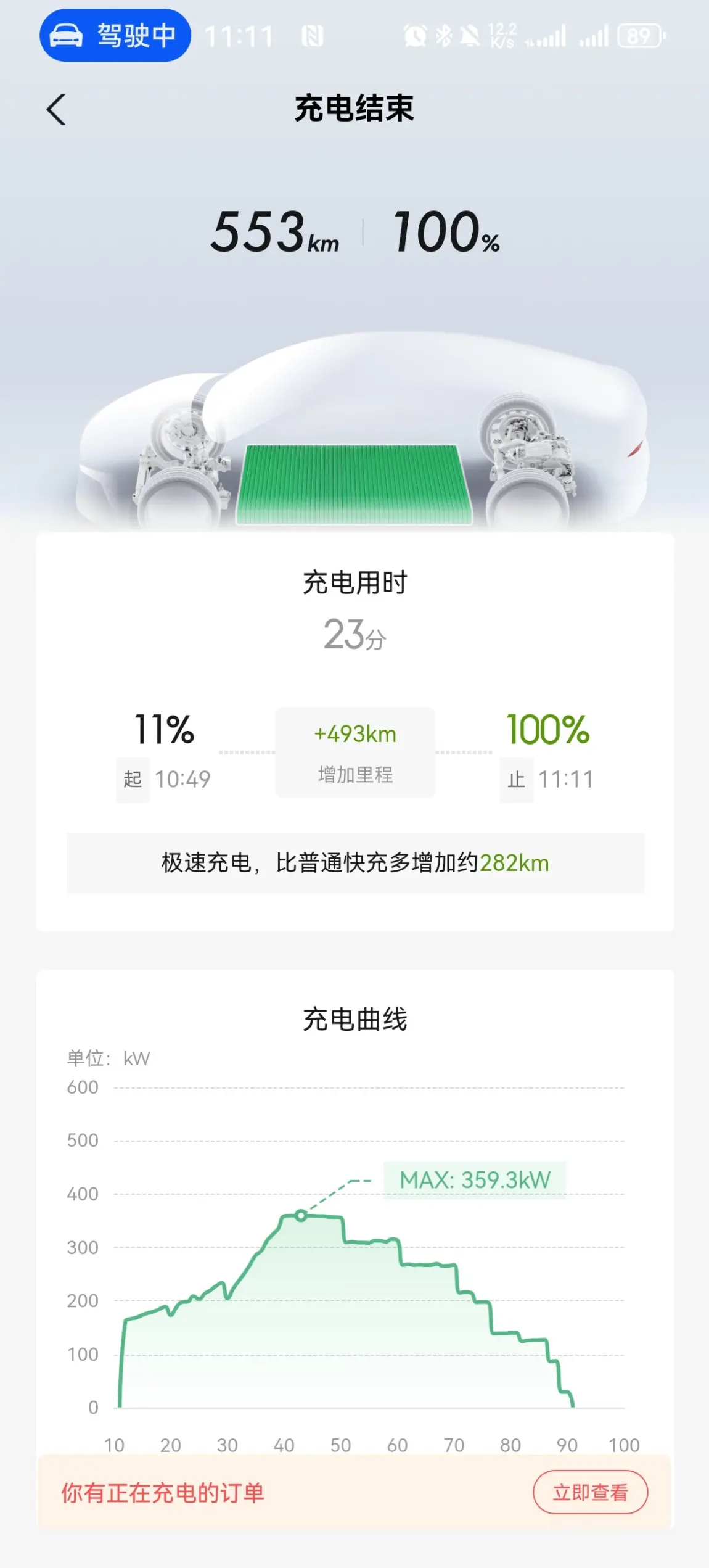 23分钟11%-100%,这个补能速度可以吧,这是在小鹏超充480KW桩,在冬天跑出来成绩,出行完全不需要担心耽误时间。就是离家最近的小鹏自营超充站都得跑个40多公里,希望小鹏自营超充站能够向县城延伸。
