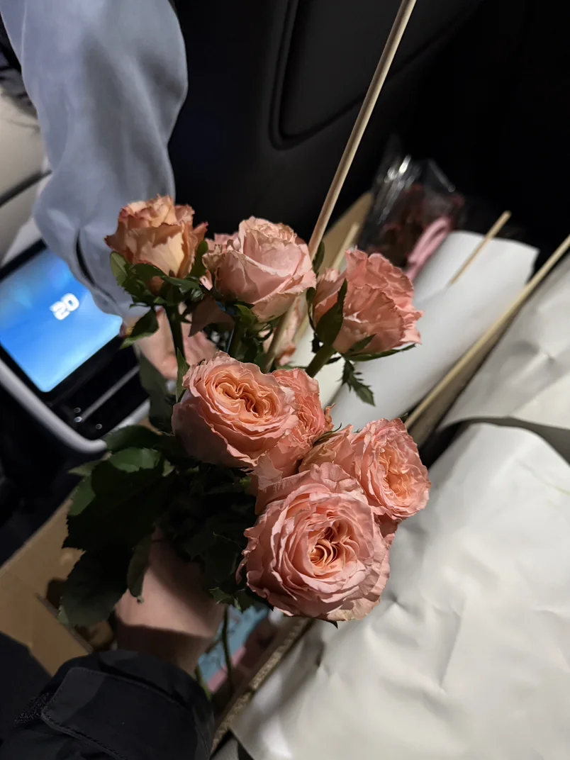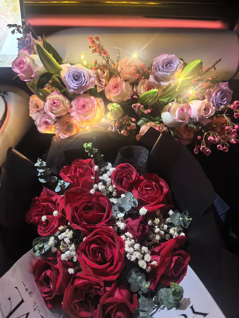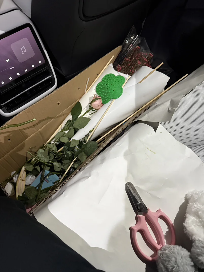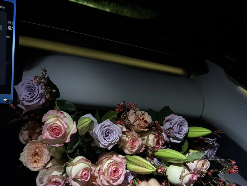 把鲜花包装放到后座上,打开后修剪,整理,摆放。吩咐小P打开手套箱,这个用来装工具物品的地方,如今把它的功能升华了,也能藏下浪漫。