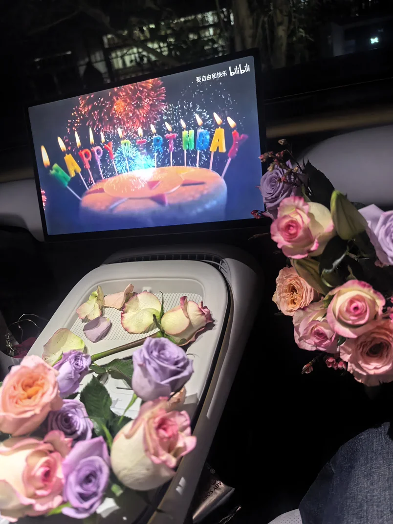 鲜花布置妥当,找来当年媳妇给我过生日时候的道具,生日快乐灯光组合,把它们放到前挡处,主题一下子就体现出来了,再加上生日快乐的超长视频,在车机大屏幕上播放起来,这氛围立马起来了。