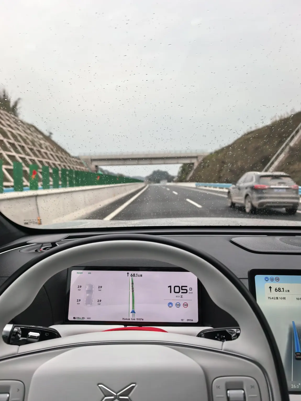 仪表盘上清晰地显示着105km/h的时速,和剩余68.1公里的路程。小鹏G9的双腔空气悬架在高速上表现稳健,过滤掉了大部分路面的颠簸,配合着NVH静谧性技术,车厢内只剩下轻微的胎噪和空调的风声,让这段旅程从一开始就充满了惬意。