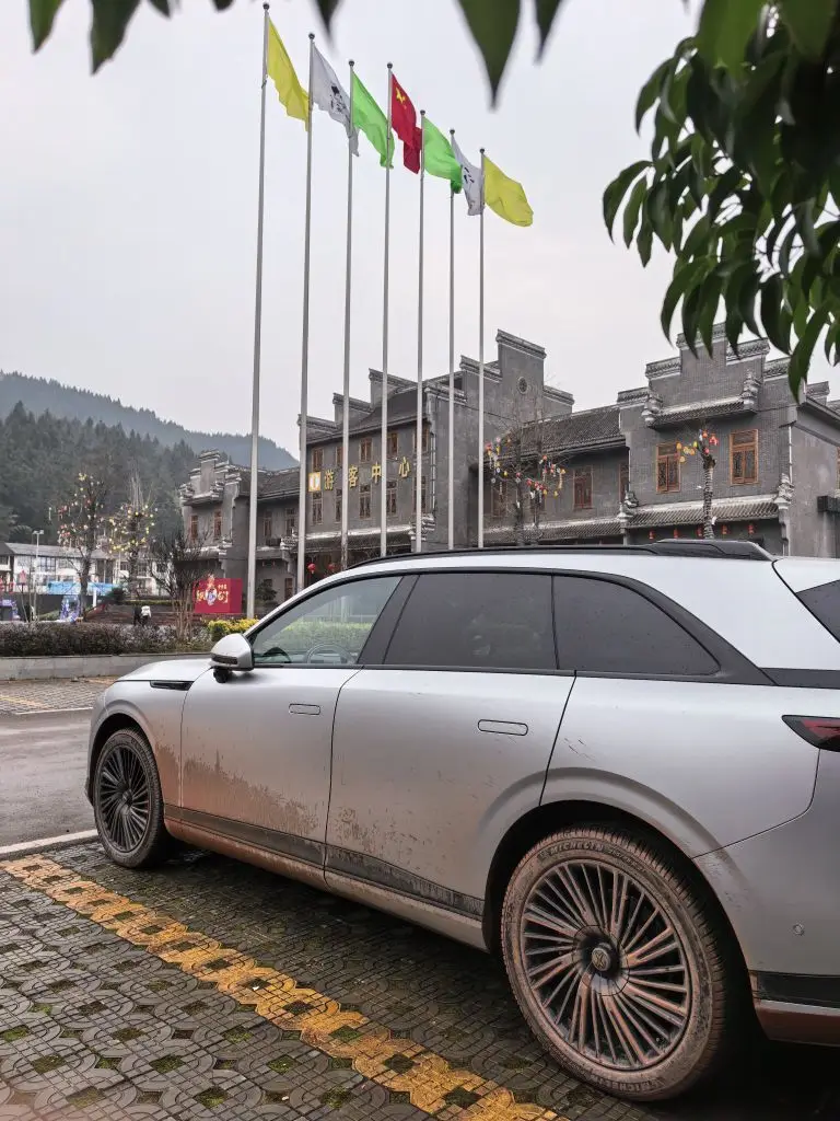 我把G9停在古镇入口的停车场,银灰色的车身在古色古香的建筑群中显得格外亮眼。车轮上还带着些许旅途的泥泞,仿佛在无声地证明着我们刚刚穿越了多少风雨。