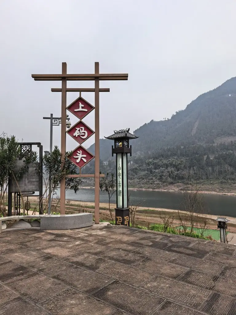 在古镇的尽头,“上码头”的牌子格外醒目。这里曾是巴河上重要的水运枢纽,如今只剩下静静流淌的河水和连绵的青山。我站在码头上回望,远处的G9与古镇的轮廓在薄雾中融为一体,现代科技与古老文明的碰撞,在此刻显得如此和谐。