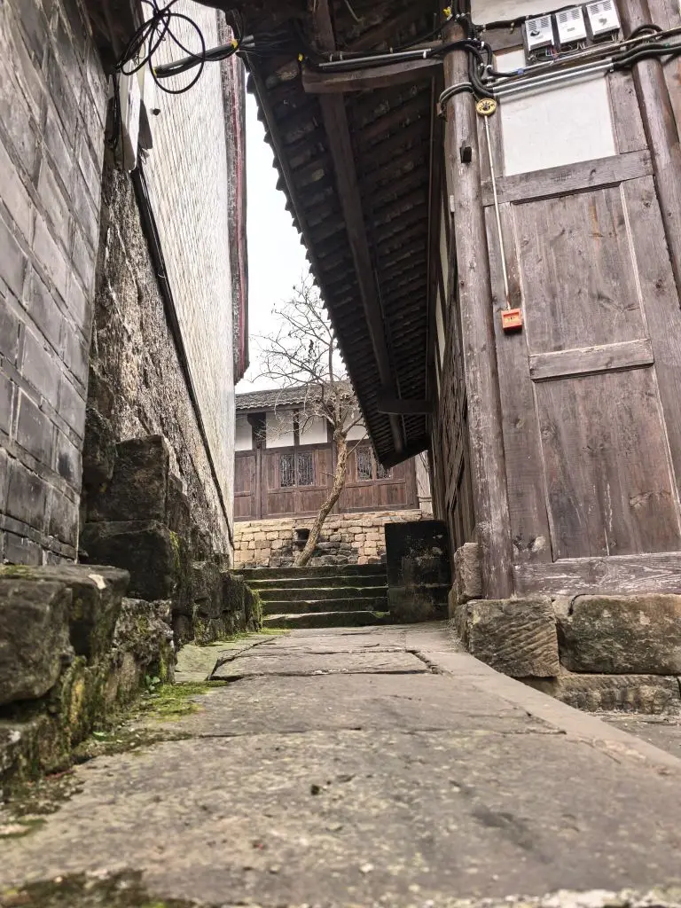 吃饱喝足,我们开始深入古镇。脚下是被岁月打磨得发亮的石板路,两侧是高耸的木构老墙,构成了一条狭长的“一线天”巷道。阳光从头顶的缝隙中洒落,在地上投下斑驳的光影,让人仿佛穿越回了明清时期。