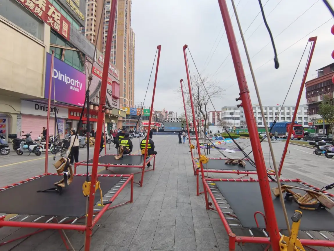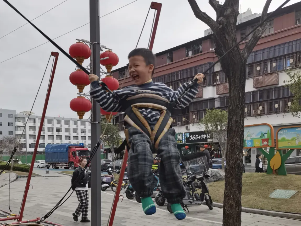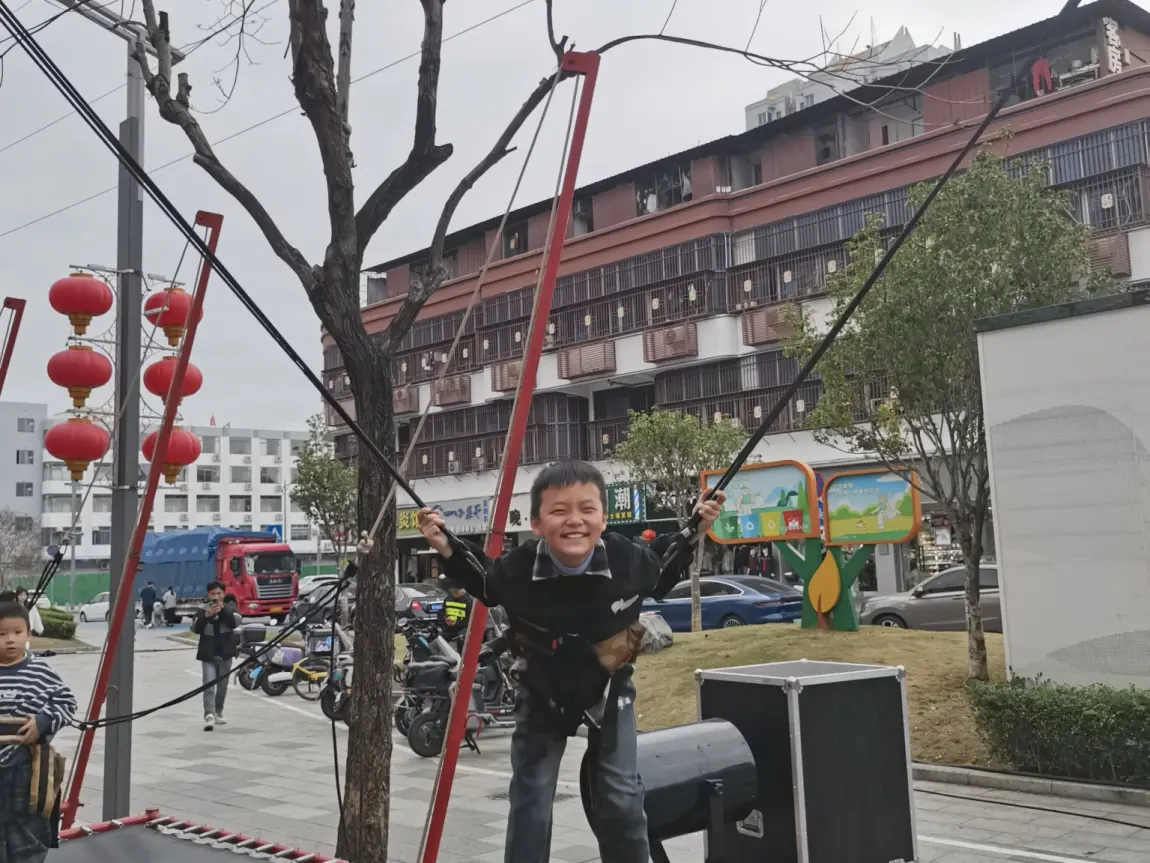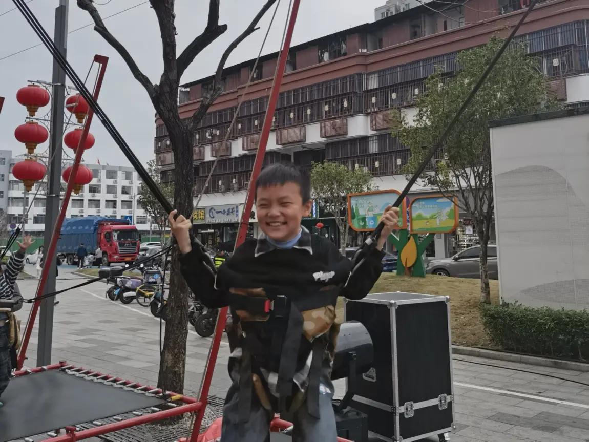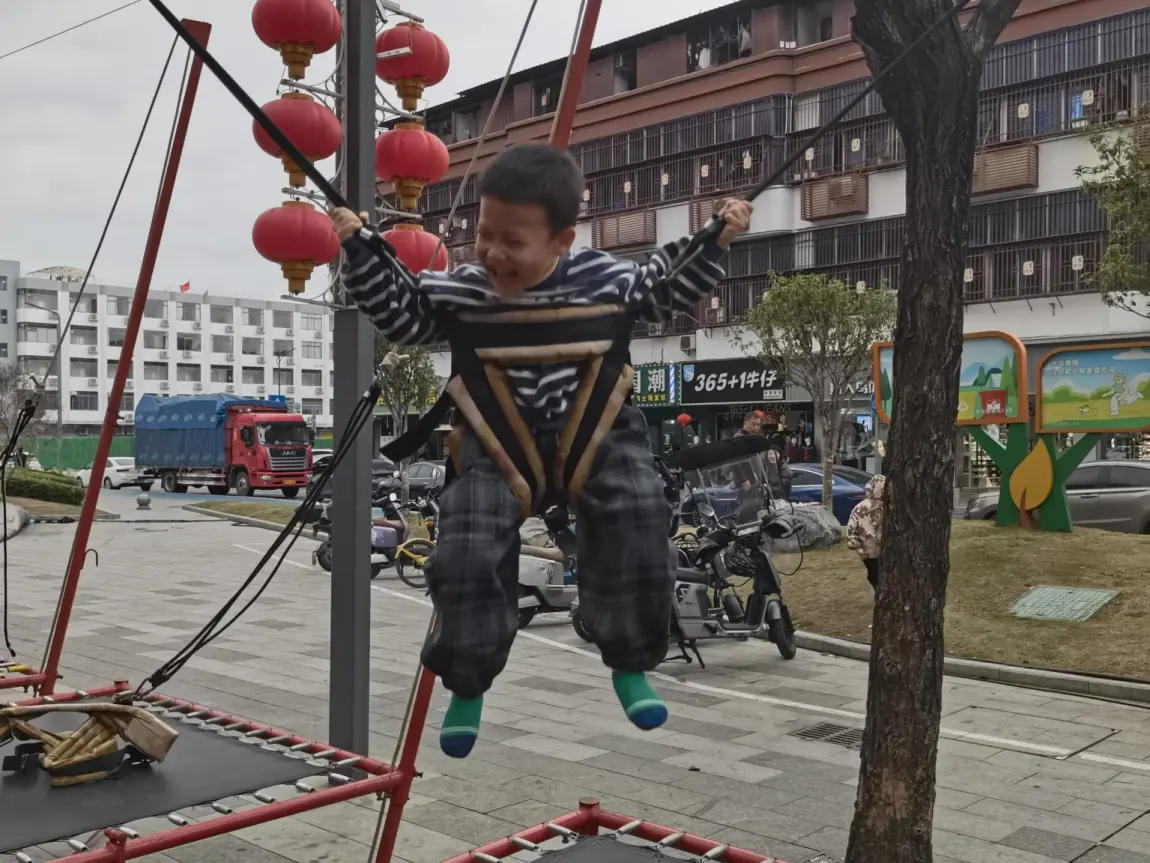 他最爱的就是那个红色的蹦床。工作人员帮他系好安全绳,他就像一只快乐的小鸟,在蹦床上弹得老高,笑声比旁边的红灯笼还要响亮。看着他在空中张开双臂,脸上洋溢着无忧无虑的笑容,我和老婆也被感染了,在旁边笑得合不拢嘴。