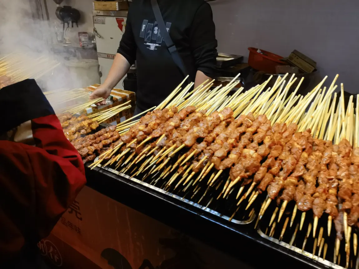 - 第一站:烤大肉串。巨大的肉串在炭火上翻滚,油花四溅,香气扑鼻。我们买了几串,咬一口,外焦里嫩,肉香四溢,孩子吃得满嘴流油。