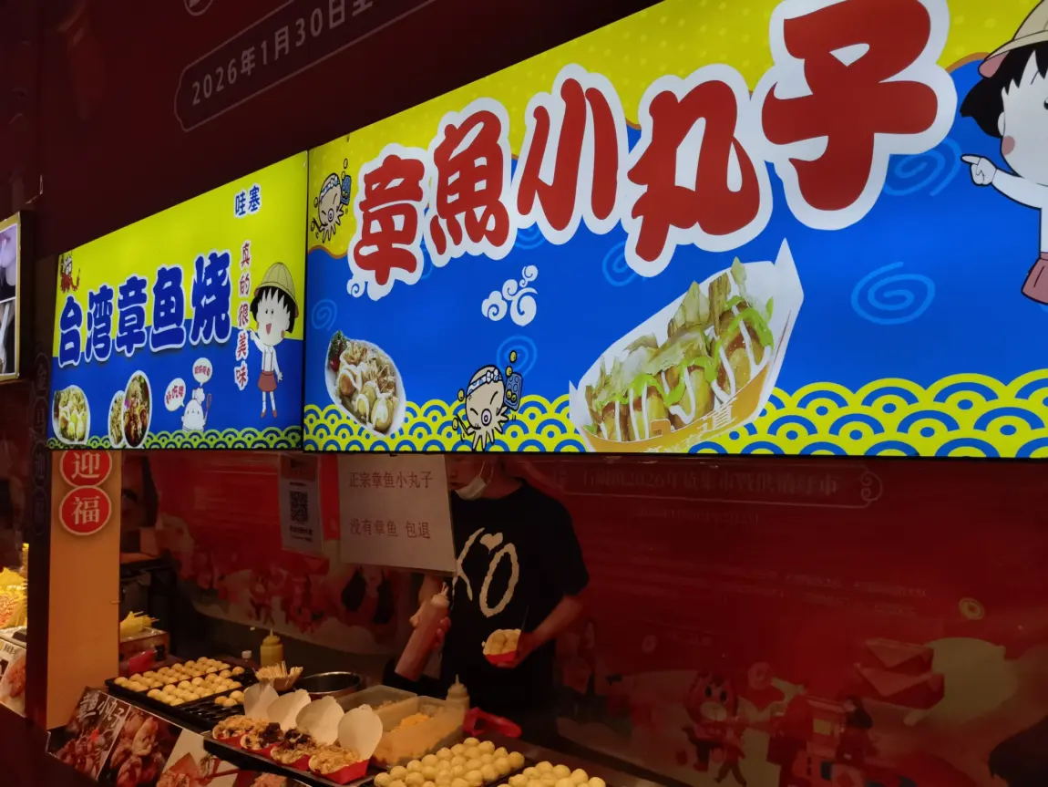 - 第三站:章鱼小丸子。摊位上写着“没有章鱼包退”,我们果断下单。刚出锅的小丸子外酥里嫩,配上沙拉酱和海苔碎,一口一个,根本停不下来。
