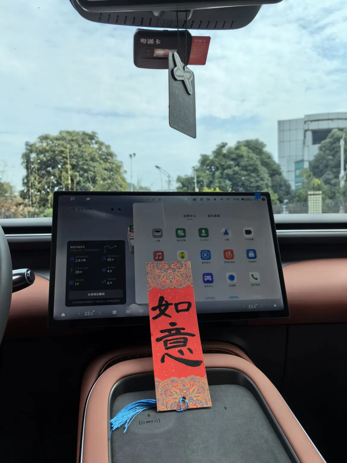 车内没有过多的装饰,只悬挂了小鹏随车送的“好运红包”,以及一张写着“八方来财”的精致小挥春,简单却年味十足。暖阳橙的内饰在冬日里显得格外温暖,与窗外的节日氛围相得益彰。