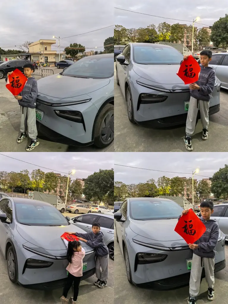 抵达村口时,夕阳洒下柔和金光。儿子手拿“福”字站在车头前,笑容灿烂;女儿同样握着“福”字,靠在车尾处,神情欣喜。而两个孩子一起举起大红对联,在G7车头前并肩站立的瞬间,被镜头永久珍藏。G7流畅的星昼灰车身在暮光中泛着细腻光泽,暖阳橙的内饰若隐若现,整个场景洋溢着团圆、科技与传统的交融之美。