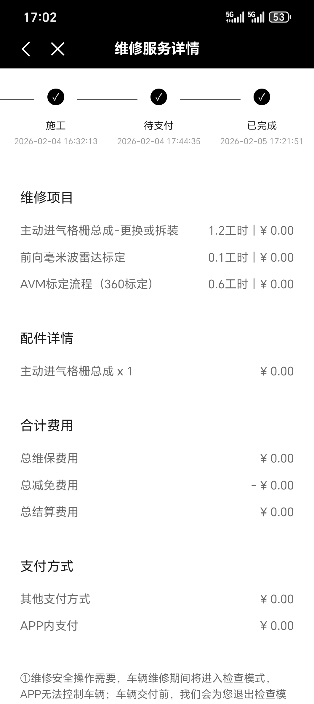 到店检查才发现是前格栅电机模块故障,本来还担心春节前配件紧张要等很久,结果售后小哥说有备货,当天就能修!