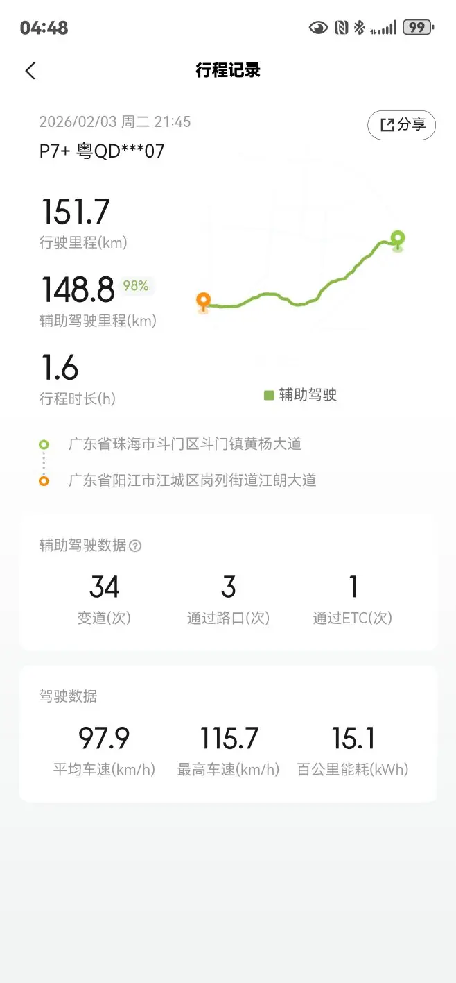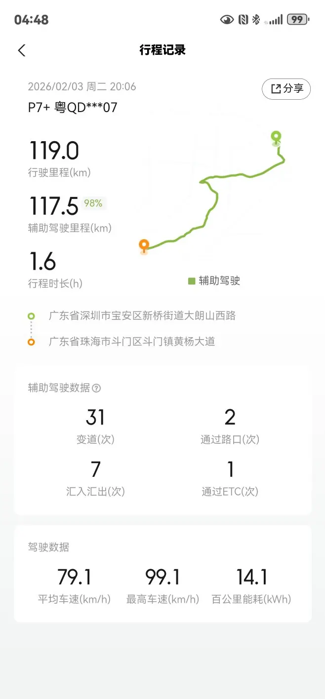 从深圳到珠海斗门服务区,全程智驾里程占比高达98%。NGP在夜间精准识别路况,跟车、变道、过弯都平顺丝滑,面对车流也能从容应对,彻底打消了我夜间开车犯困、视线不佳的顾虑。在服务区短暂休整后再次出发,从斗门到阳江,NGP依旧表现出色,智驾占比依旧稳定在98%。夜间这样的智驾占比,绝对是我的辅助驾驶的高光时刻!