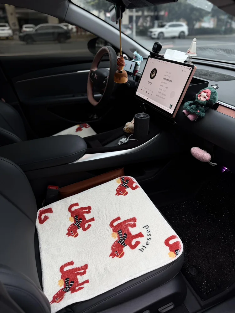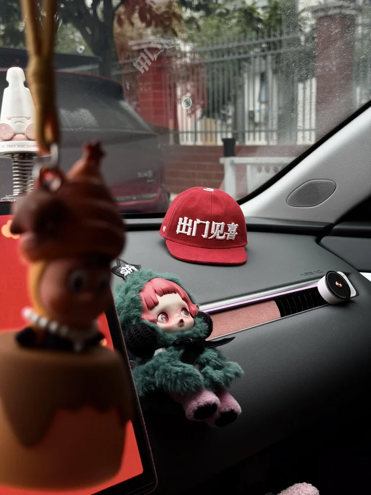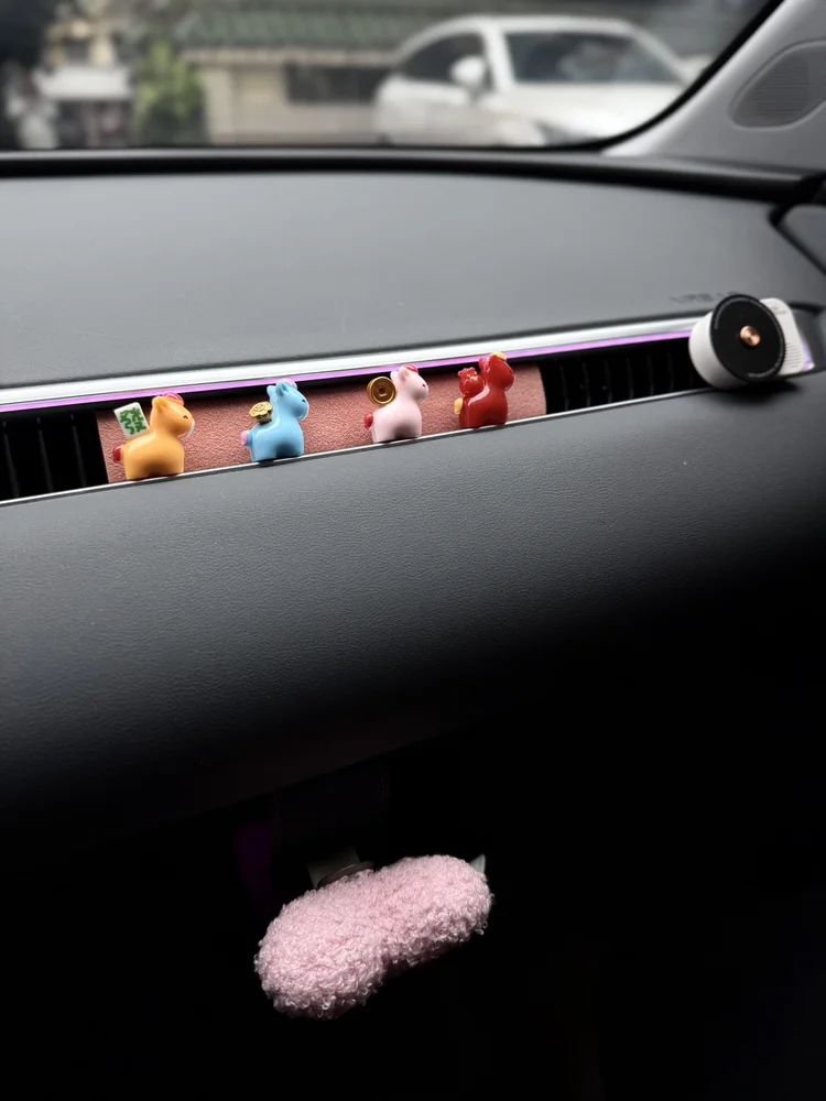 仪表台是我最花心思的地方。从前,这里有圣诞小喵乐队,有可口可乐的香薰,还有那些可爱的小毛线帽。现在,它们都被一套马年主题摆件取代。中央是一棵用红金两色丝线编织的迷你摇钱树,树下站着两匹戴着圣诞帽的小马,一匹在“弹吉他”,另一匹在“打鼓”,组成了我的专属“马年乐队”。旁边的香薰也换成了马头造型,随着空调的微风散发出淡淡的木质香气,整个车厢都充满了既复古又新潮的年味。