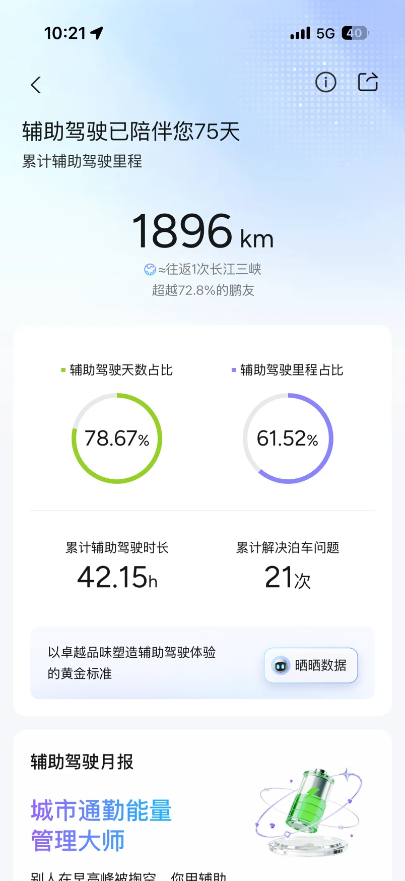 提车两月有余,小鹏G6的辅助驾驶我已经用了75天,累计里程1896km,按照小鹏的估算,这个里程差不多能往返一次长江三峡,比72.8%的鹏友用得都多,总时长也达到了42.15小时,彻底解放了双脚,大幅提升了通勤舒适性。