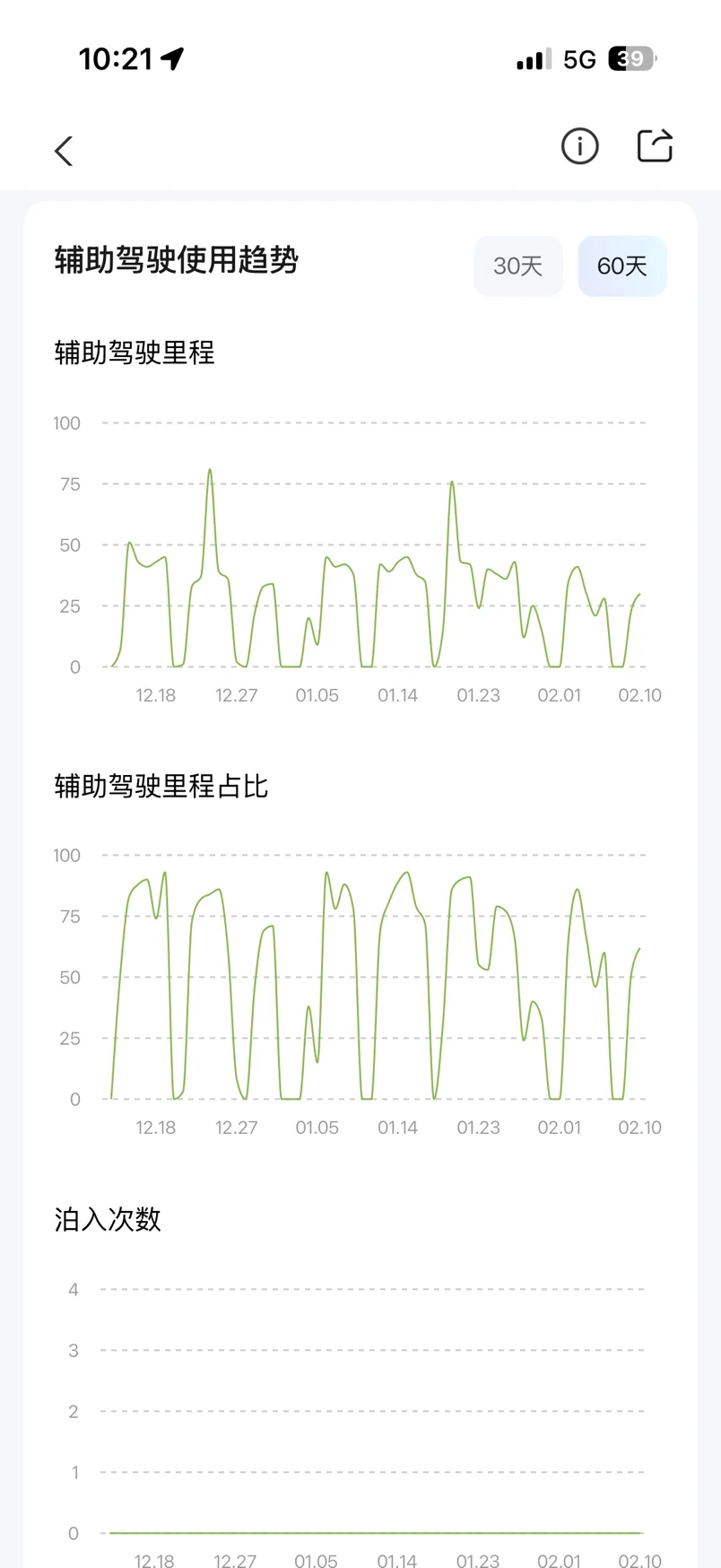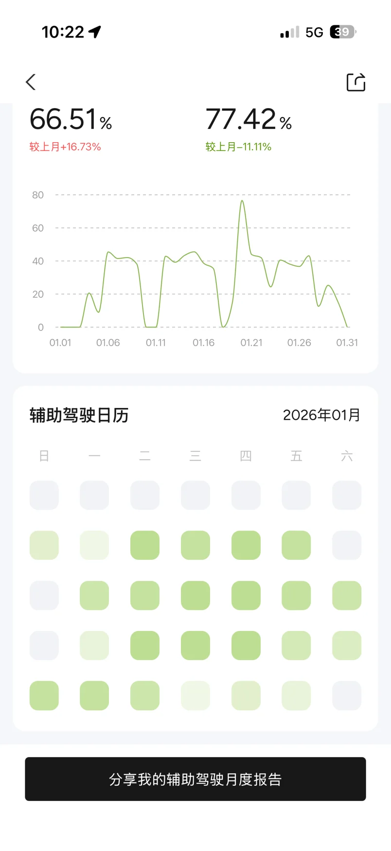 我每天上下班的路程特别适合智驾,高架和快速路能占到90%,除了偶尔赶时间会手动驾驶,其余时候基本都交给G6。看1月的辅助驾驶日历就知道,工作日上班几乎天天用,周末出行不多,使用频率就稍低一些。